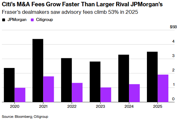 在首席执行官简·弗雷泽的带领下,该行第四季度财务咨询费大幅增长84%,推动全年并购业务收入同比增长超五成,创下历史纪录。根据周三发布的财报,这一业绩表现明显优于其更大竞争对手摩根大通(JPM.US),后者2025年此项业务仅增长6%。