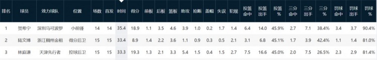 本赛季,CBA实行40分钟赛制,截至目前,场均出场时间前三的球员为贺希宁、陆文博、林庭谦。