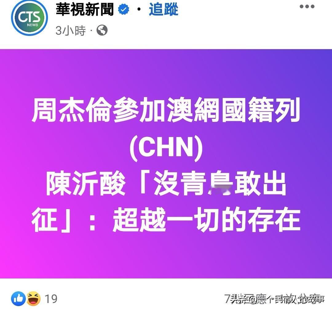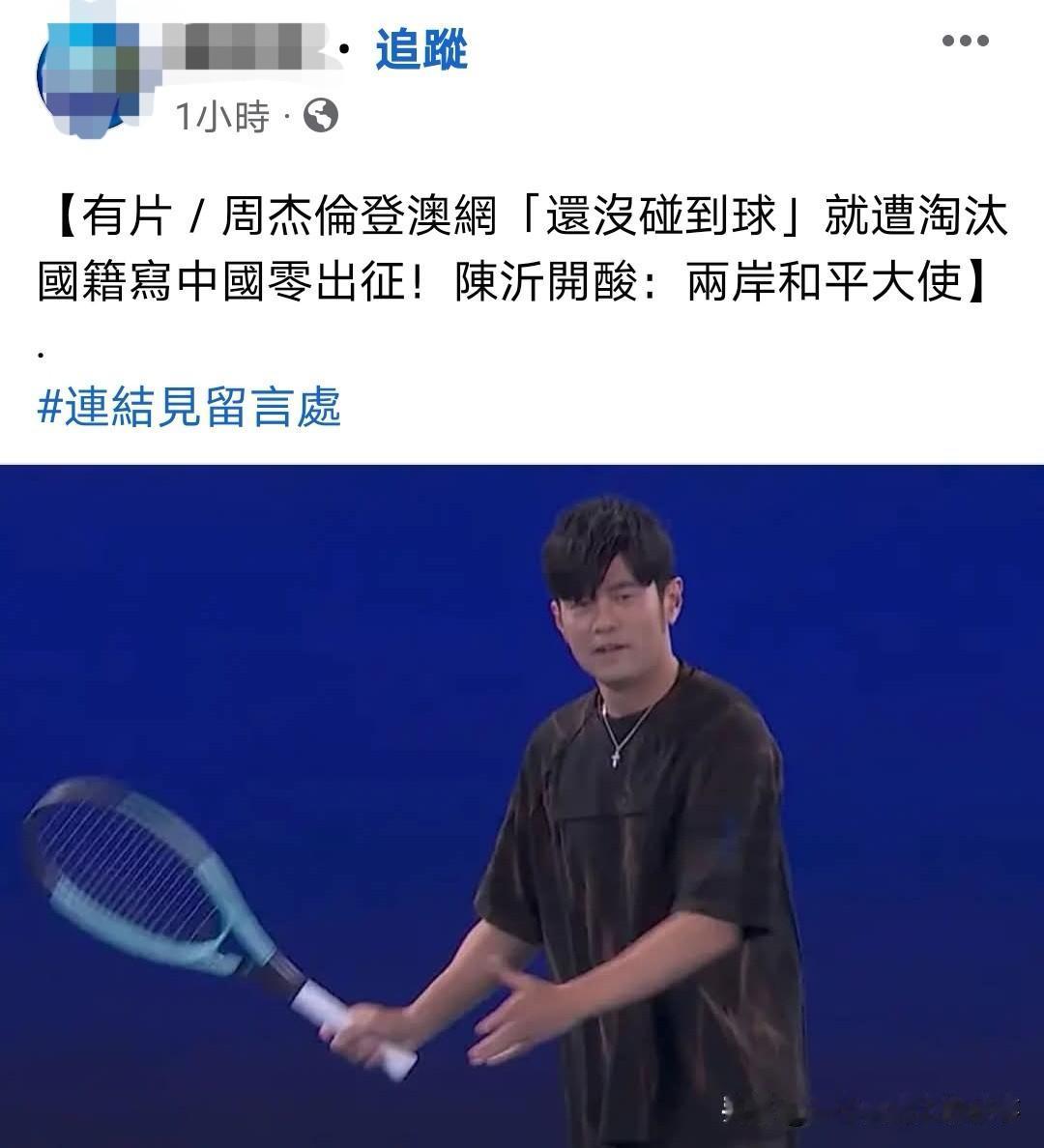 周杰伦国籍标中国让岛内蓝绿媒体集体破防!叹为啥连中华台北都不选! 今天澳网公开赛开始,华语歌坛顶流天王周杰伦参加一分大满贯表演赛。周杰伦出赛国籍选中国,而不是另一位台湾选手选择的中国台北(岛内称中华台北)!结果因为国籍标示让岛内不分蓝绿媒体都破防了,三立等绿媒嘴硬说周杰伦是台湾歌手啦,蓝媒质疑周杰伦为啥不选中华台北! 周杰伦不愧是顶流天王,蓝绿只能暗戳戳酸疑问,却不敢像批其他艺人一样出征周杰伦,连那些蓝绿网民也是,只敢在自家媒体下发牢骚,不敢去周杰伦账号骂。台湾网红陈沂叹:只有周杰伦敢这样,其他艺人早都被骂臭头了。
