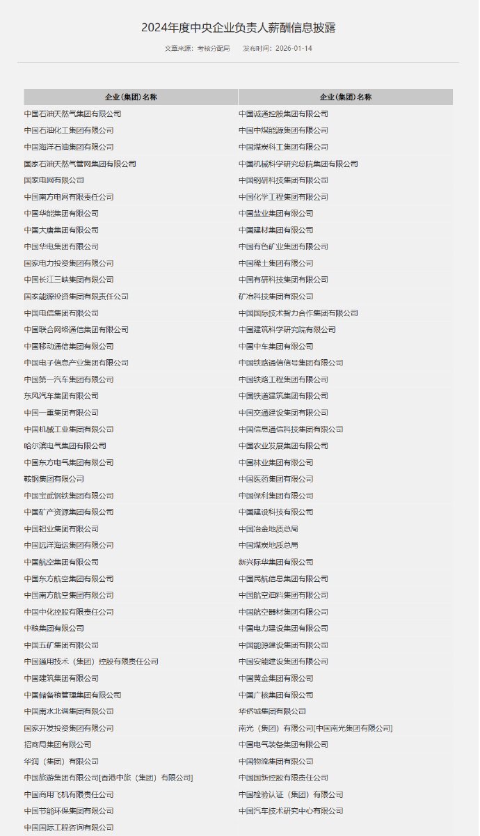[#80多家央企负责人薪酬公开#]1月14日,国务院国资委网站通过提供各中央企业薪酬信息披露网页链接的方式,披露了所监管的80多家央企负责人2024年度薪酬信息。这是国资央企持续抓好重点领域信息公开、回应公众关心关切的重要举措。(新华社)