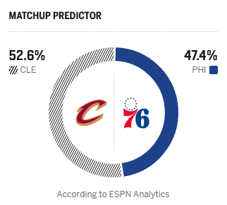ESPN预测明日比赛:骑士胜率52.6%,76人胜率47.4%