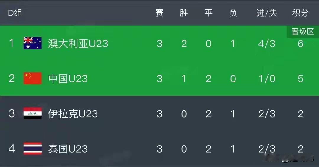 见证历史! 中国U23男足首次打进亚洲杯淘汰赛! 刚刚结束的男足U23亚洲杯小组赛最后一轮,中国队0:0逼平泰国队,以1胜2平积5分列小组第二名,力压上届冠军伊拉克队闯进八强。这是中国参加6届亚洲杯首次实现小组不败,且0失球。 在同组另一场比赛中,刚刚0:1输给中国的澳大利亚队在先失1球的不利局面下,分别在补时阶段的第93分钟和第97分钟和攻进1球,2:1逆转击败上届冠军伊拉克队,以2胜1负积6分获得小组头名,携手中国队打进淘汰赛。 中国队淘汰赛对手是另一个小组2:0击败韩国队的乌兹别克斯坦队,两队的1/4决赛将于1月17日进行。