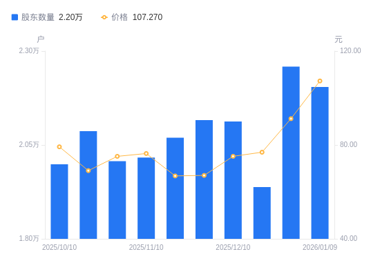 日期A股户数(户)流通A股户均持股数(股)户均持股市值(万元)2026-01-092204310300.24110.492025-12-312258610052.6091.682025-12-191937811716.8090.112025-12-102112410748.3580.782025-11-282116010730.0671.922025-11-202069510971.1673.302025-11-102016611258.9585.962025-10-312006911313.3785.022025-10-202086610881.2475.152025-10-101998611360.3589.99