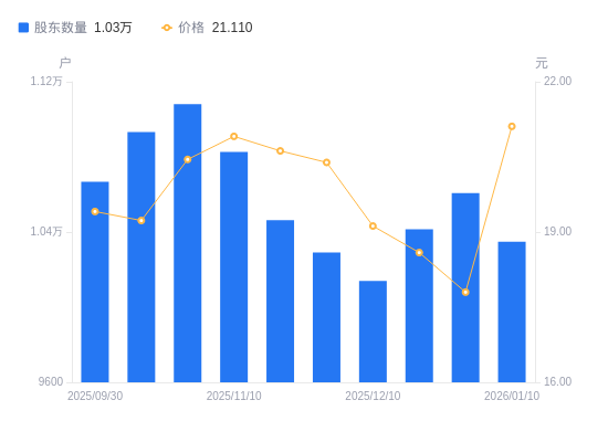 日期A股户数(户)流通A股户均持股数(股)户均持股市值(万元)2026-01-101034910878.7322.962025-12-311060710614.1218.892025-12-201041510809.7920.102025-12-101014011102.9521.232025-11-301029110940.0422.312025-11-201046310760.1922.192025-11-101082710398.4421.742025-10-311108110160.0920.782025-10-201093210298.5719.802025-09-301066710554.4120.49
