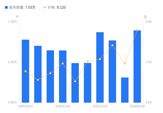 日期A股户数(户)流通A股户均持股数(股)户均持股市值(万元)2026-01-097032019826.1216.102025-12-316098622860.5415.912025-12-196834020400.5415.482025-12-106996519926.7214.172025-11-286386921828.6315.352025-11-206383921838.8913.852025-11-106635121012.0814.622025-10-316636221008.6013.912025-10-206726820725.6513.242025-10-106847820359.4313.62