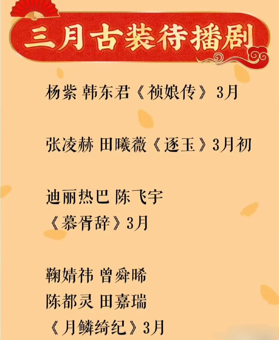 三月古装剧有看头!杨紫迪丽热巴鞠婧祎等新剧开播! 不敢想三月会有多热闹,杨紫的《祯娘传》,迪丽热巴的《慕胥辞》,鞠婧祎陈都灵的《月鳞绮纪》,加上95🌸田曦薇的《逐玉》。 这几部都有可看的点,不知道各位更想看哪一部?! 杨紫 迪丽热巴 鞠婧祎 陈都灵