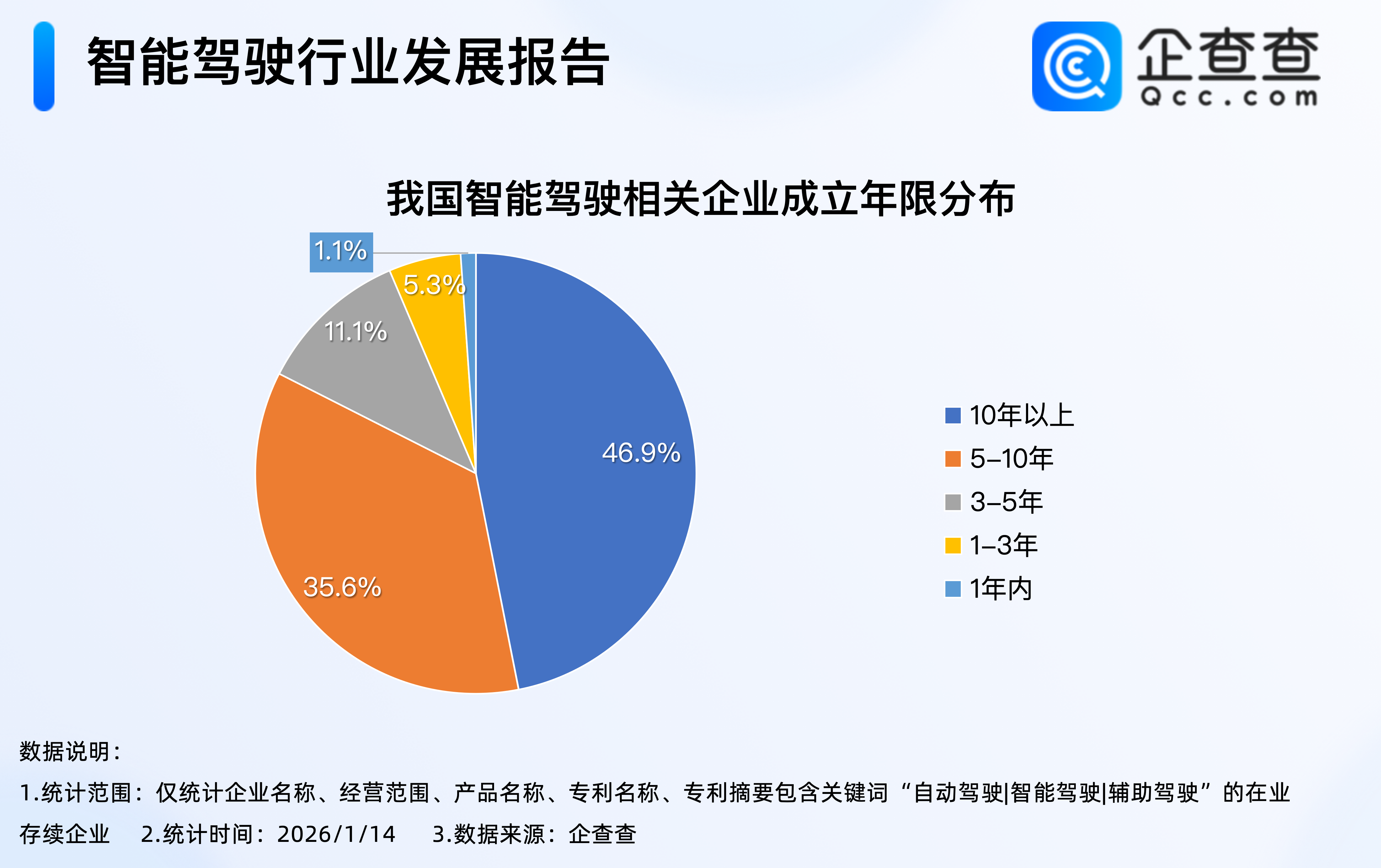 企查查数据显示,成立年限方面,我国智能驾驶领域以老牌企业为主,近五成企业成立超10年,另有成立5至10年之间的企业,占比达35.6%。