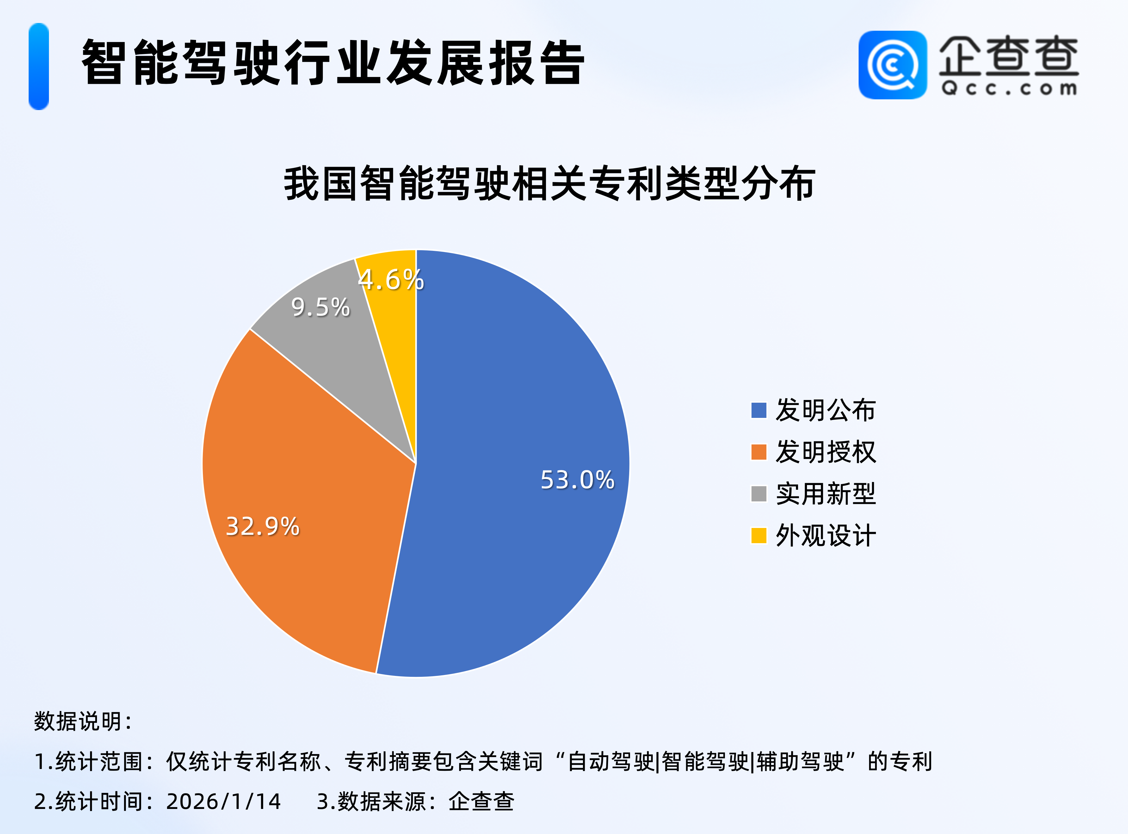 企查查数据显示,我国现存5.1万项智能驾驶相关专利,类型为发明专利的最多,合计占比85.9%,其中发明公布最多,占比53.0%,其次是发明授权,占比32.9%,外观设计相关专利相对最少,占比4.6%。