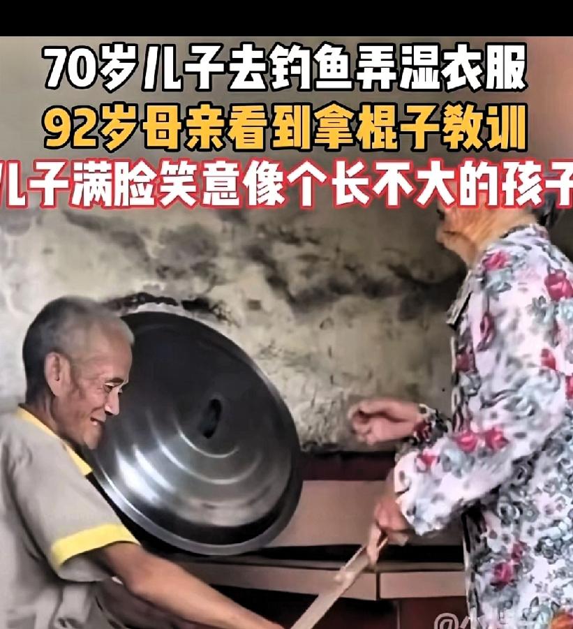 太幸福太温馨了!泪目了! 无论自己多大!父母健在!自 己在父母面前永远还是个孩子…… 70岁大爷出去钓鱼,回来后衣服都弄湿了,当被92岁的妈妈发现后,拿着棍子教训,70岁的儿子满脸笑意,像个没长大的孩子。这画面太温馨了,让人羡慕的幸福!