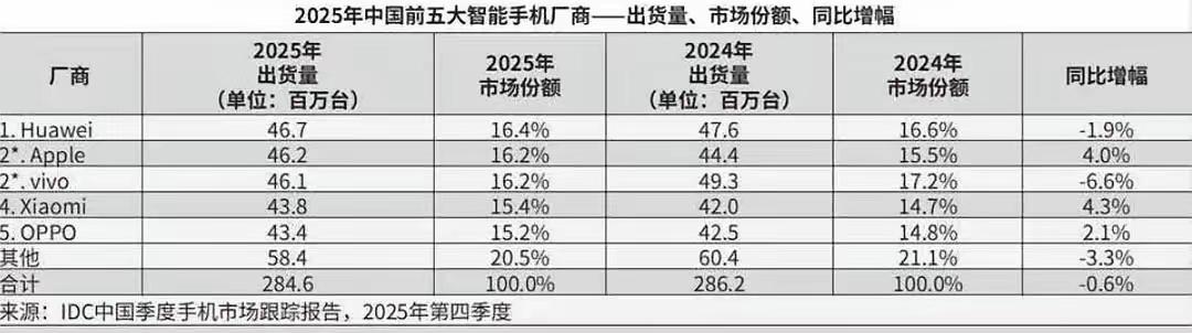 随着麒麟芯片、5G能力恢复,鸿蒙OS 6.0生态协同;Mate 80系列加量不加价,影像与续航拉满,引爆市场。华为重夺国内手机市场“王座”,可喜可贺。2025年我也贡献了一部Mate70手机,非常好用,使用起来相当的丝滑,特别满意拍照功能。 虽然华为重夺国内手机市场“王座”,但还达不到遥遥领先,还需努力加油。因为从高端机销量来看,苹果销量还是第一的,华为在国产高端中领跑,小米高端崛起明显。 2025年中国智能手机市场报告,华为4670万台、16.4%;苹果4620万台、16.2%;vivo 4610万台、16.2%;小米4380万台、15.4%;OPPO 4340万台、15.2%。 2026年手机市场的竞争会越来越激烈,国产品牌会在高端机上大做文章,进一步挤压苹果手机的份额。而华为手机产品密集上新、技术与生态双升级,会有一定的优势,份额预计会有上升。