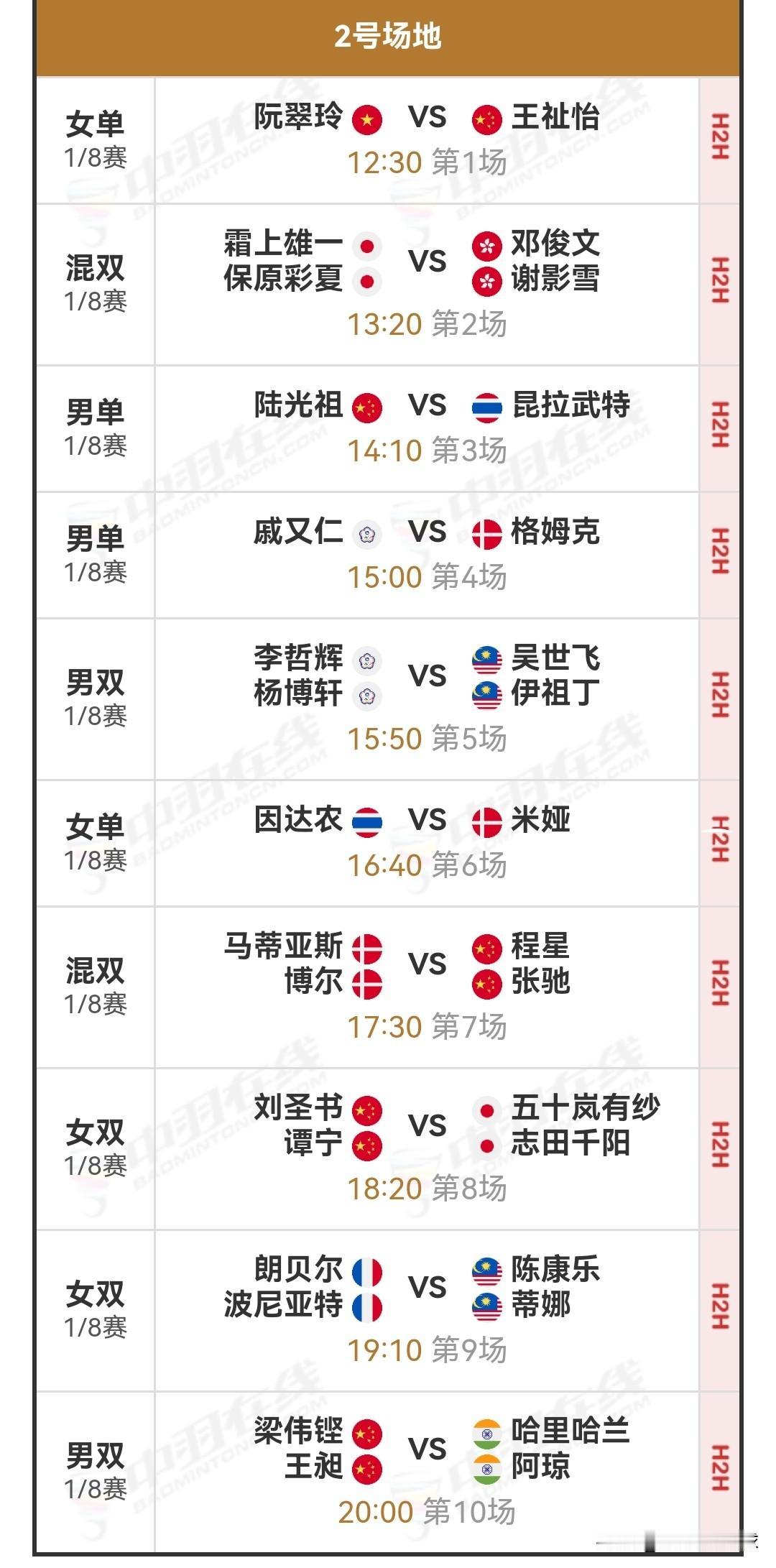 1月15日印度羽毛球公开赛1/8决赛安排 今日国羽战况斐然,取得10胜2负的佳绩。星驰组合直落两局击败陈堂杰/杜颐沩,黄荻/任翔宇同样两局完胜阿斯特鲁普/安德斯。陈雨菲以两局优势淘汰林湘缇,韩悦历经三局苦战逆转宋硕芸,陆光祖两局击败贺首维。凤凰组合、酱板鸭组合、王祉怡、圣谭组合皆战胜各自对手,郭新娃/陈芳卉因对手赛前退赛,不战而胜。 然而,王正行激战三局不敌骆建佑,连续七站一轮游;100分组合连丢两局负于省队刘广珩/杨博涵,今年连续两站一轮游。 经过两日的激烈角逐,首轮1/16决赛全部结束,国羽共斩获12胜3负的战绩。 此外,今日金元浩/徐承宰等多名球员赛前退赛。不少球员反映印度办赛条件欠佳,孙俊教练在微博提及印度新德里空气污染严重,还调侃球员需戴口罩参赛,安东森也在个人社交账号发文称,印度比赛场馆脏乱差。更为棘手的是,今年羽毛球世锦赛也将在印度新德里举办…… 明日北京时间12:30,1/8决赛将拉开帷幕,四块场地同时开赛。明日陆光祖将对阵昆拉武特,陈雨菲迎战布桑兰,圣谭组合对决五十岚有纱/志田千阳,详细对阵安排如下: 羽毛球 羽毛球爱好者 羽毛球比赛 国羽赛程 羽毛球公开赛 羽毛球赛事 羽毛球赛程 陆光祖 陈雨菲 安东森