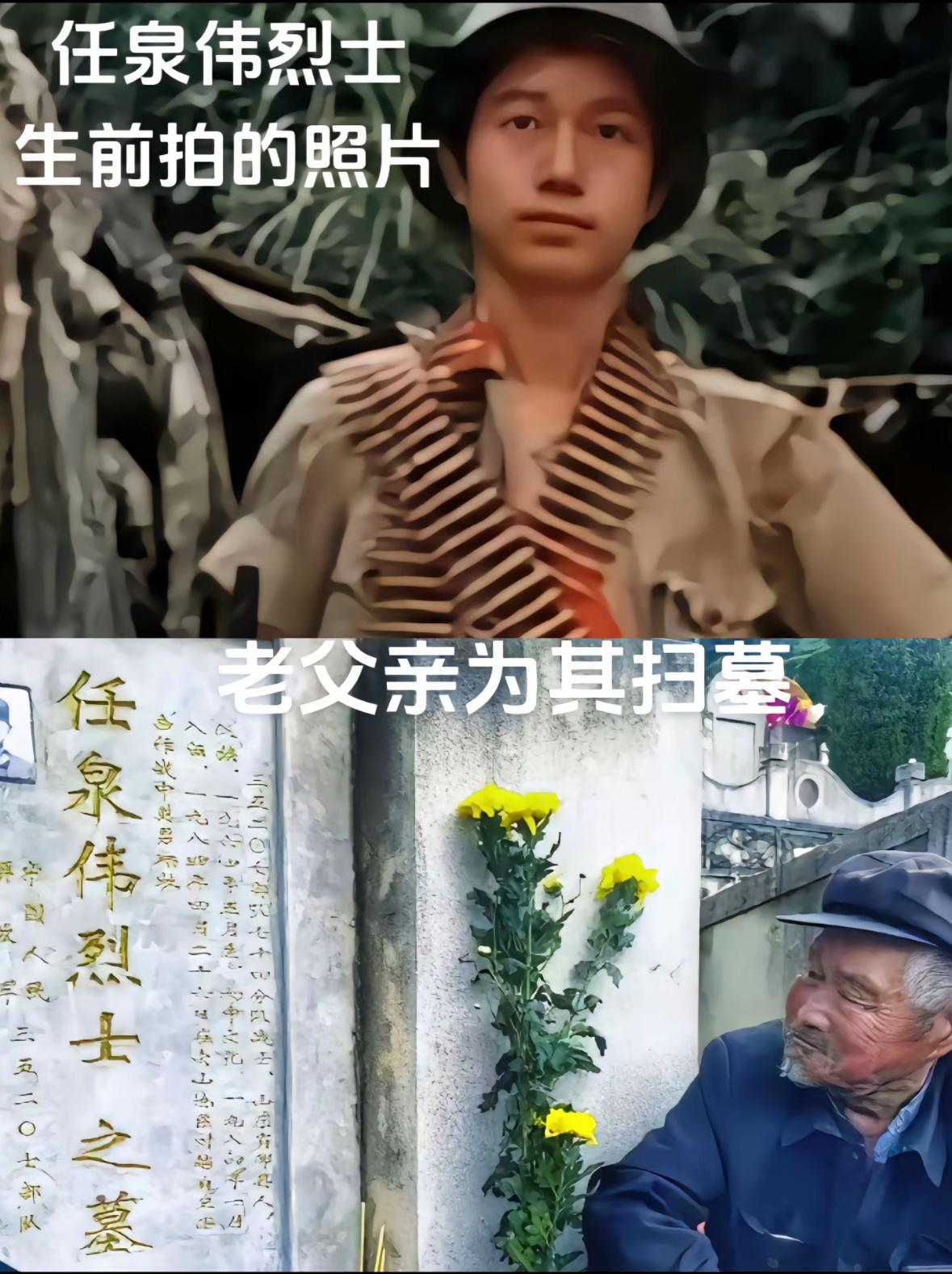 照片上的小战士头戴钢盔,身穿65式军装,手里拿着一把枪,胸前腰上挂满了子弹,他的名字叫任泉伟。 1964年3月出生于山东济宁市(邹城市‌),1984年1月参军入伍,原解放军35207部队分队战士,1984年4月28日在老山作战中,入伍不到三个月任泉伟,在参加老山主峰战斗中,敌人高居临下,对我军展开了火力压制,当任泉伟爬到半山腰时,不幸被炮弹击中,当场壮烈牺牲!年仅20岁。葬于麻栗坡烈士陵园,位置在6台47号。 得知儿子牺牲,悲痛万分,母亲过度伤心,最终去世。父亲一直有个心愿,在有生之年到麻栗坡烈士陵园看望牺牲的儿子,无奈家境贫寒,凑不出路费。父亲任承水,为凑齐路费,34年来不停的捡废品,就是为能早日去看望儿子!2018年4月28日,已经88岁高龄的任承水,和其弟弟一家人,从山东千里迢迢,终于如愿以偿的来到了烈士陵园看望到了儿子,扶着墓碑,悲痛万分!这也是烈士任泉伟第一次有亲人来为他扫墓! 一句话,道尽了世间最沉重的父爱与遗憾。父亲的眼中满满的自豪感 ,自己的儿子虽未尽孝道但却精忠报国,老父亲一辈子也就来了这一次,也是最后一次来了 ,最后看一眼自己的儿子,也算当父亲的对儿子的思念,或许老人家心中在想:不是我这个当父亲的不愿意来,而是没有钱来啊 !能来一次也不容易希望你不要怪我 ,至此麻栗坡烈士陵园个个都是为国牺牲的豪杰精忠报国!向烈士致敬!也向这位伟大的父亲致敬!