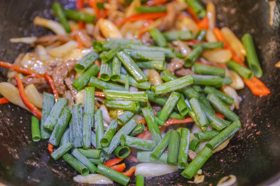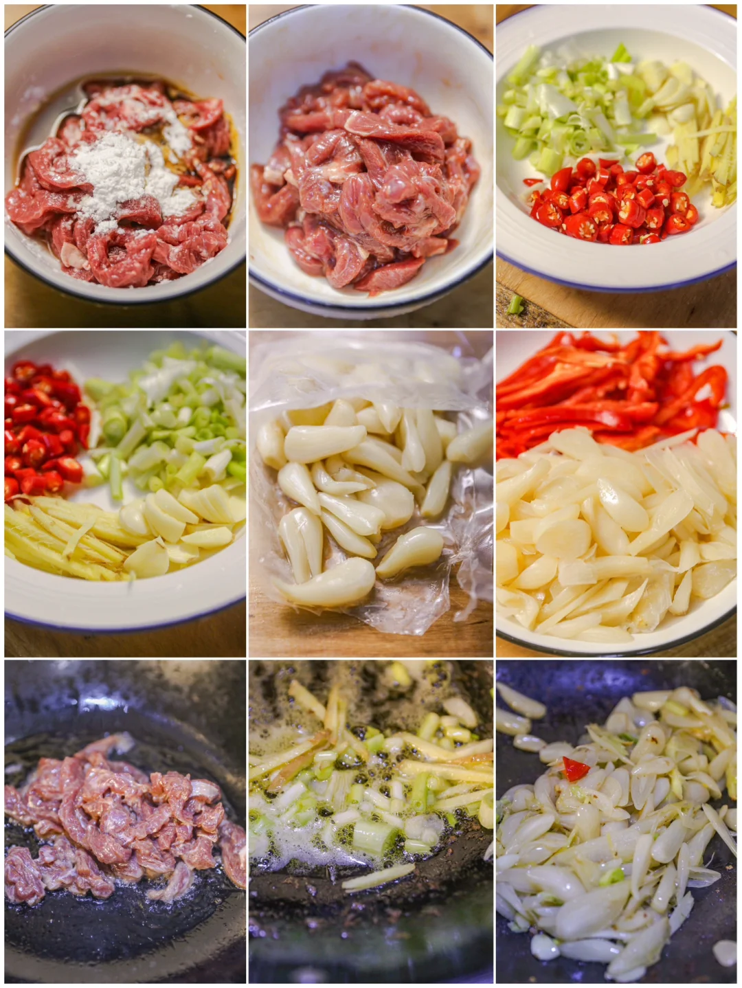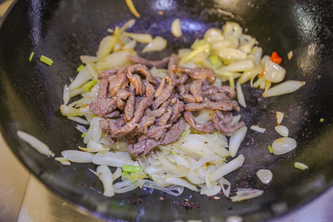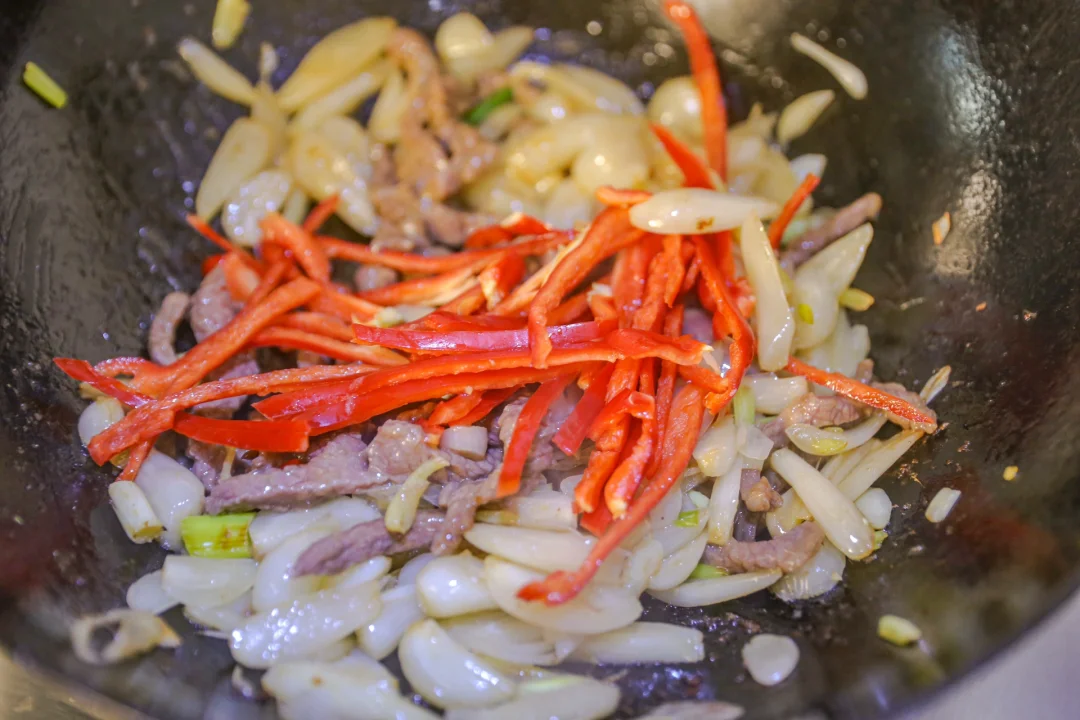 牛肉条爆炒藠头片: 1:牛肉切成丝,加入生抽、食盐、白胡椒粉、玉米淀粉、黄酒抓匀,放入菜籽油锁住水分,腌制20分钟。 2:锅烧热,加入腌制好的牛肉条炒变色,盛出备用。 3:锅中再次加菜籽油,放入葱姜蒜爆香,加入藠头片,翻炒变色,加入炒变色的牛肉条,放入红椒条,翻炒均匀,出锅放入葱绿段即可。 碗中加入高汤,把面条放入,加入炒好的牛肉藠头即可。