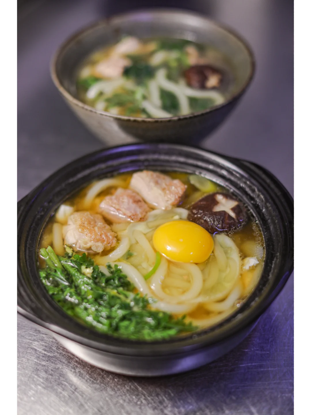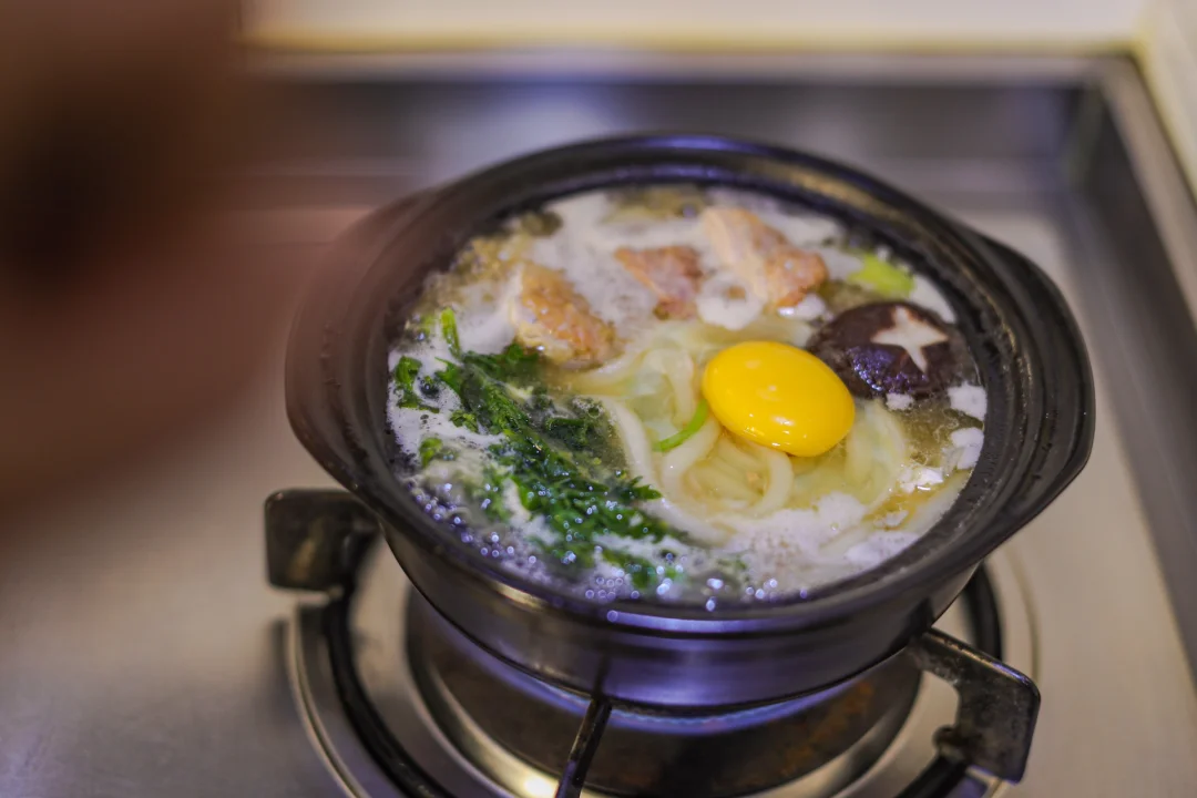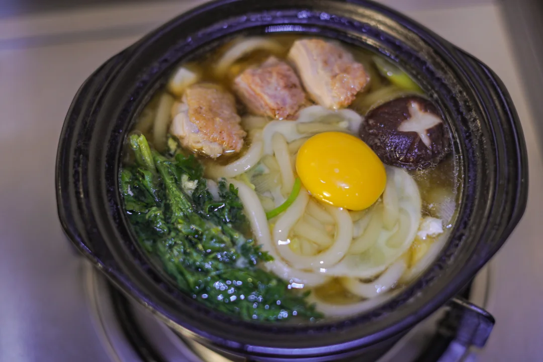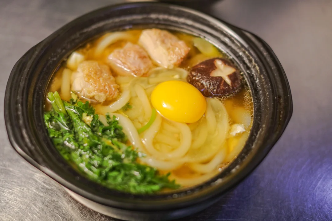 乌龙面放在锅子里煮多久也不会糊掉,吸入浓浓的汤汁,让每一根面条都特别入味,加入半熟的鸡蛋,又可以享受到不一样的美味。