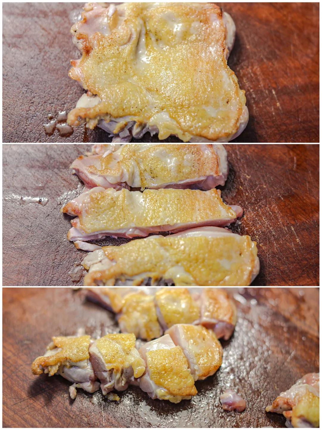 [种草R]2.锅里放一点食用油,开小火,鸡腿肉鸡皮朝下,煎到金黄色,取出来,切成容易吃的大小。