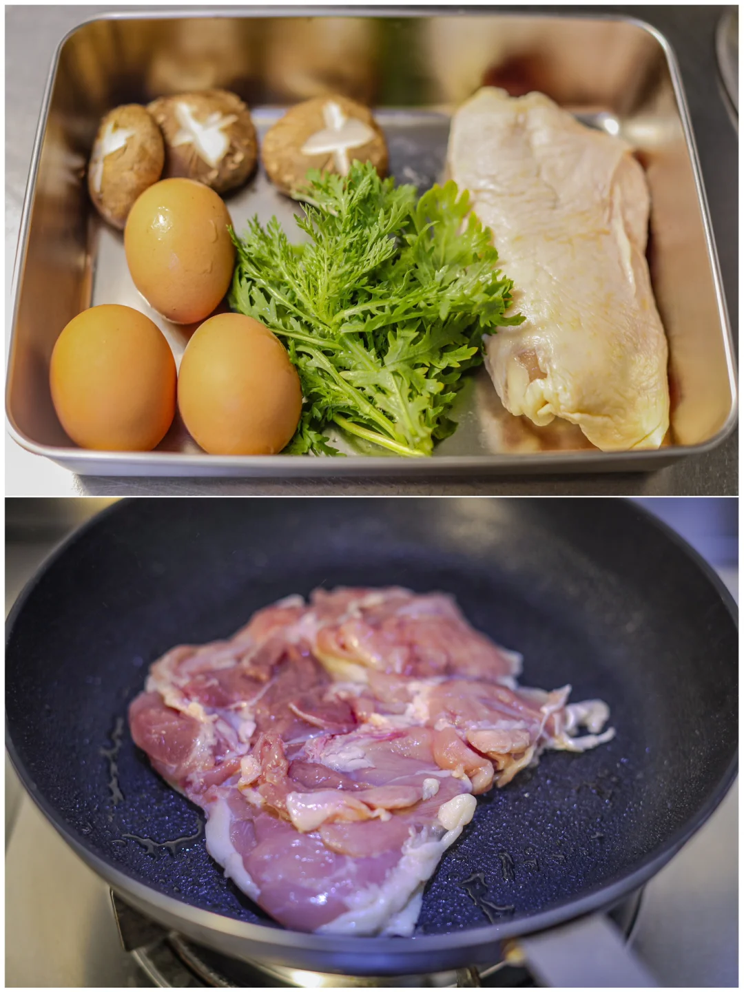 [种草R]4.煮滚之后放入葱和鸡腿肉,煮到鸡腿肉变熟。