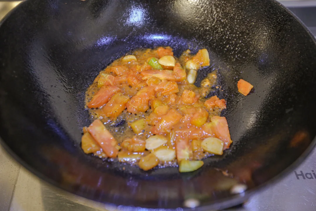 🌟3.趁着底油,加入蒜片炒香,把切好的西红柿块炒出汁液。