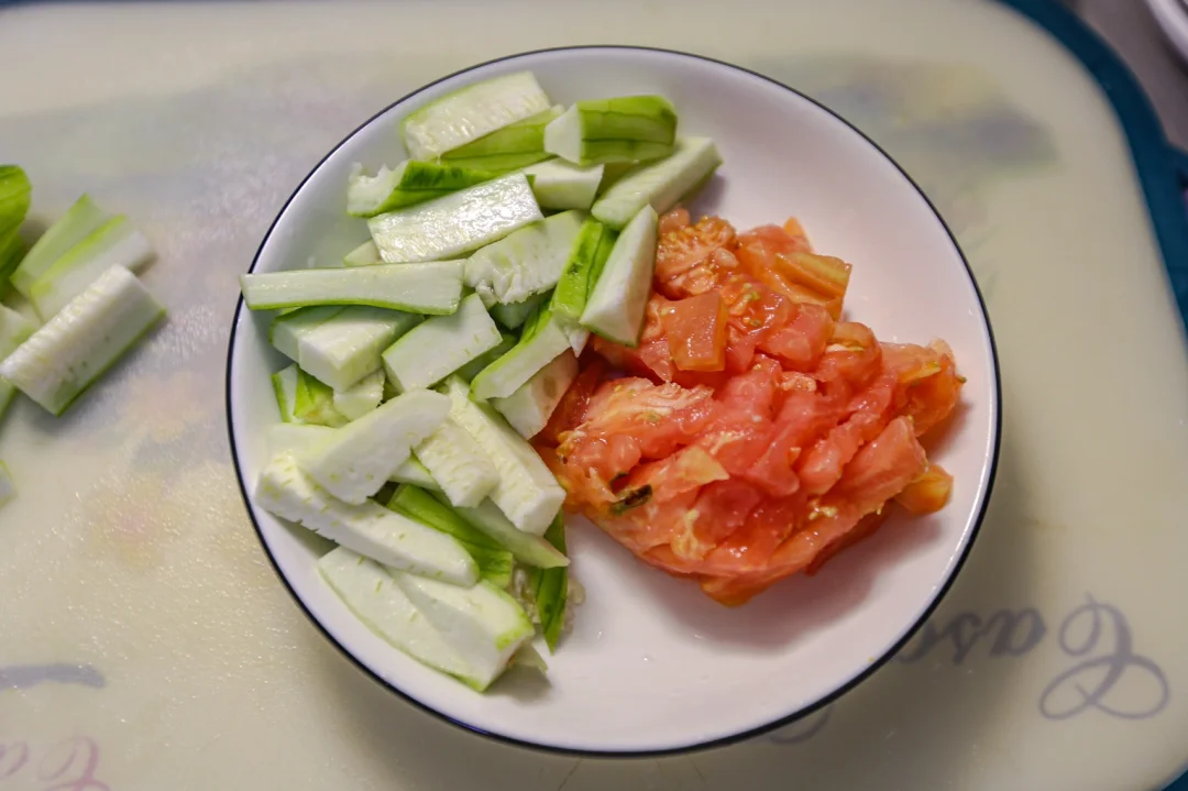 🌟1.西红柿去皮,切成丁儿。丝瓜去皮切条。