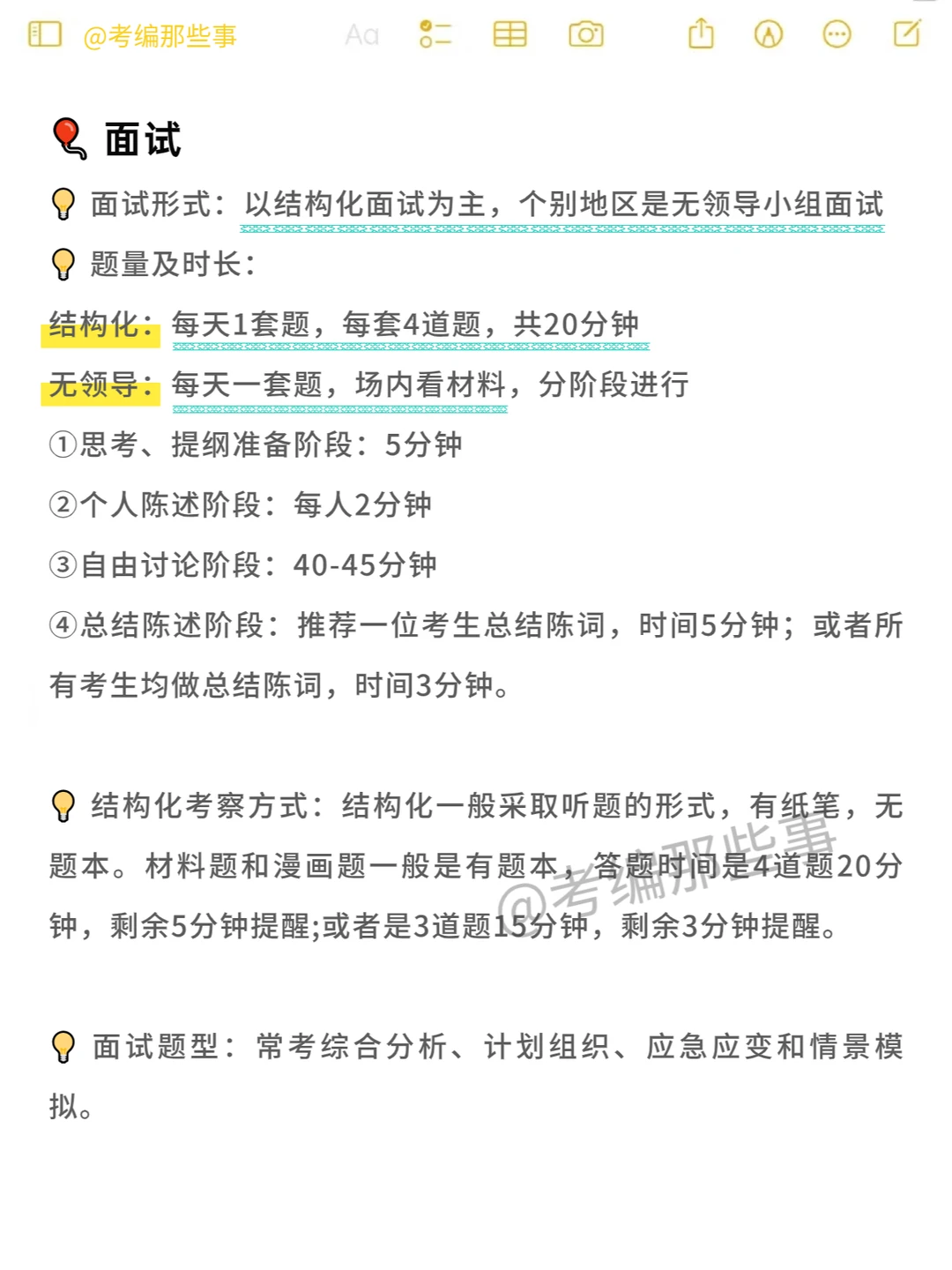 💡结构化一般采取听题的形式,有纸笔,无题本。材料题和漫画题一般是有题本,答题时间是4道题20分钟,剩余5分钟提醒;或者是3道题15分钟,剩余3分钟提醒。