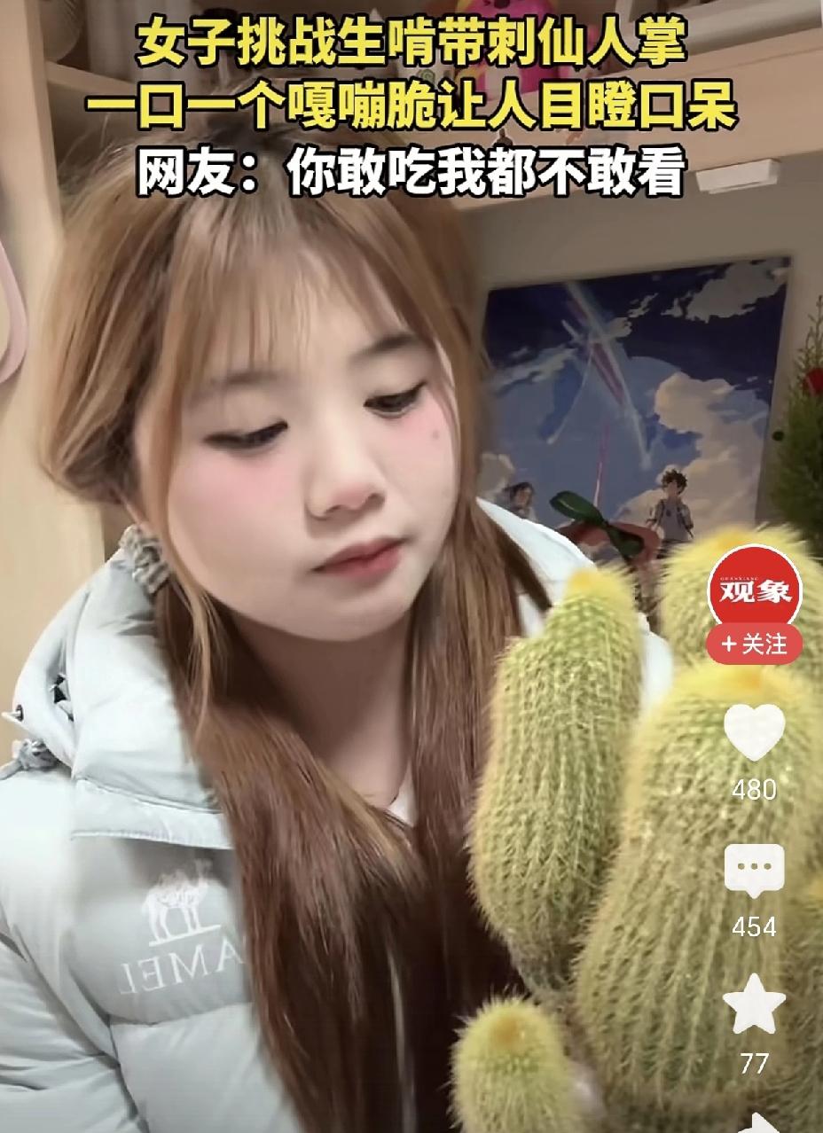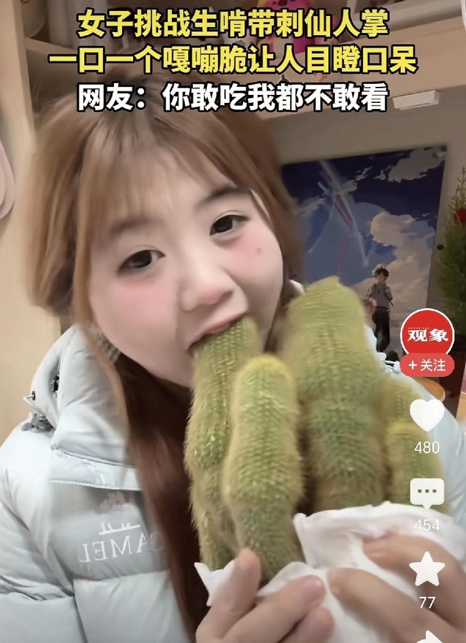 这个小姐姐是铁嘴吗? 竟然敢挑战生啃带刺的仙人掌,一口一个咯嘣脆,看得我是目瞪口呆。 难道吃下去嘴巴不会被刺划伤吗,吞下去喉咙也受不了呀。 有网友说,小姐姐敢吃,我却不敢看。 何必呢,为了一点流量,折磨自己,万一吃这个伤了身体得不偿失哇。棕刺仙人掌 可食用仙人掌 仙人掌水果 银手指仙人掌 磨牙仙人掌