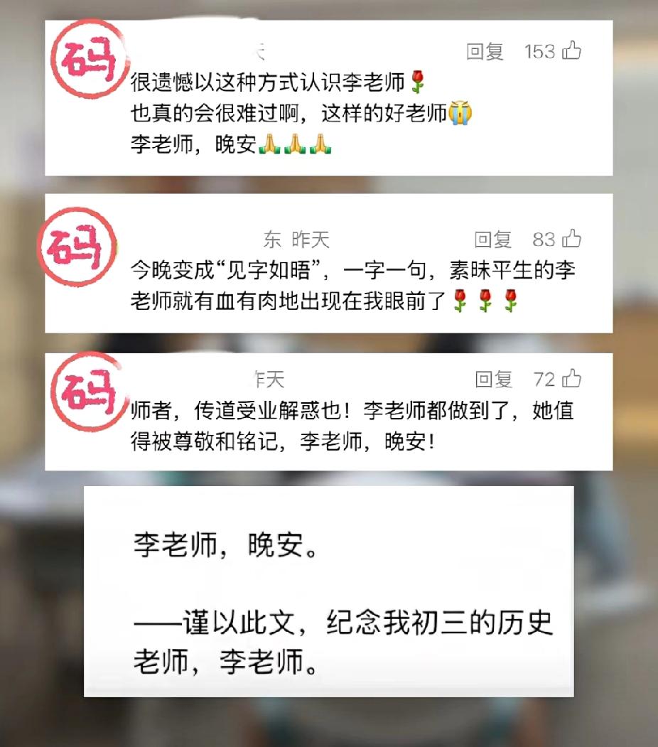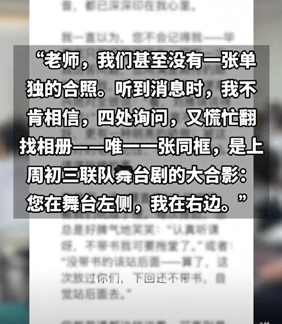 泪目!近日,广东广雅中学的一位女士发朋友圈悼念刚刚去世的历史老师李洁华,长文案令人泪流满面! 这位历史老师是一位很严厉的老师,她爱拖堂,爱唠叨。她会指责孩子不带书,也会在孩子埋怨自己拖堂时赖自己。 突然的意外让她离开了这个世界,永远离开了课堂,永远离开了让她牵肠挂肚的孩子们。消息很快传遍了整个学校,她的孩子们都沉默了! 一个女生发了一条长长的朋友圈悼念她。回忆初二初三时与李洁华老师相处的点滴。 “今天就讲到这吧,免得你们又说我拖堂。” 她总感觉没有将自己的知识全部传授给孩子们。 “现在都初三了,还有的学生上课不带书,这怎么行呢?”她从不放弃任何一个孩子,哪怕这个孩子上课连书都不带。 这位女生说,我甚至连一张和李老师的合照都没有。我总感觉到毕业的时候可以和李老师照一张照片,没想到,离别竟然来得如此突然。 她翻遍了自己在这所中学所有的照片,希望能找到一张自己和李老师的合影。最后却只找到了一张文艺汇演时的大合影,李老师在最左边,她在最右边。 “李老师,晚安。” 在女生的世界里,始终只愿意相信,那个爱唠叨、爱埋怨、爱操心的李老师只是睡着了而已。