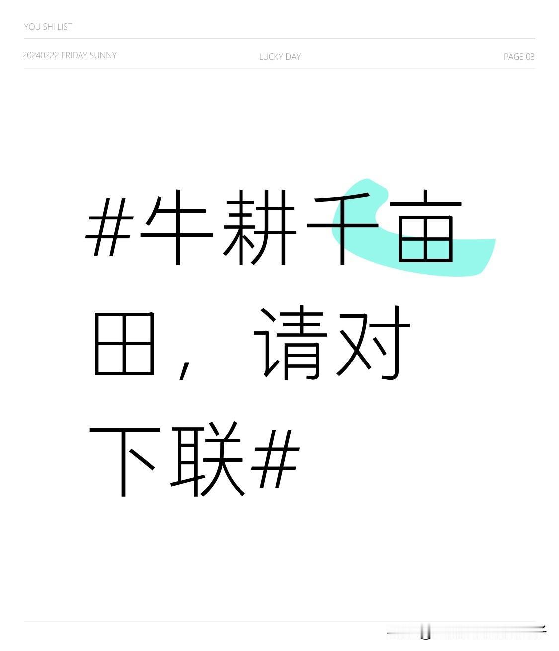 “牛耕千亩田”真是个超棒的上联,我想到两个下联。 第一个是“人守万担粮”。咱农民伯伯每天跟着老黄牛天不亮就下田,牛勤勤恳恳犁地,人精心侍弄庄稼,浇水、施肥、除草一样不落。看着庄稼从幼苗长成丰收的样子,心里满是欢喜,守着的就是这一年的收成。 另一个是“女御万丈夫”。牛是传统农耕象征,女在世俗里是弱质形象,“耕”和“御”、“千亩田”和“万丈夫”形成强烈反差。再配上“木兰从军”的横批,打破世俗,尽显女性的非凡气魄。