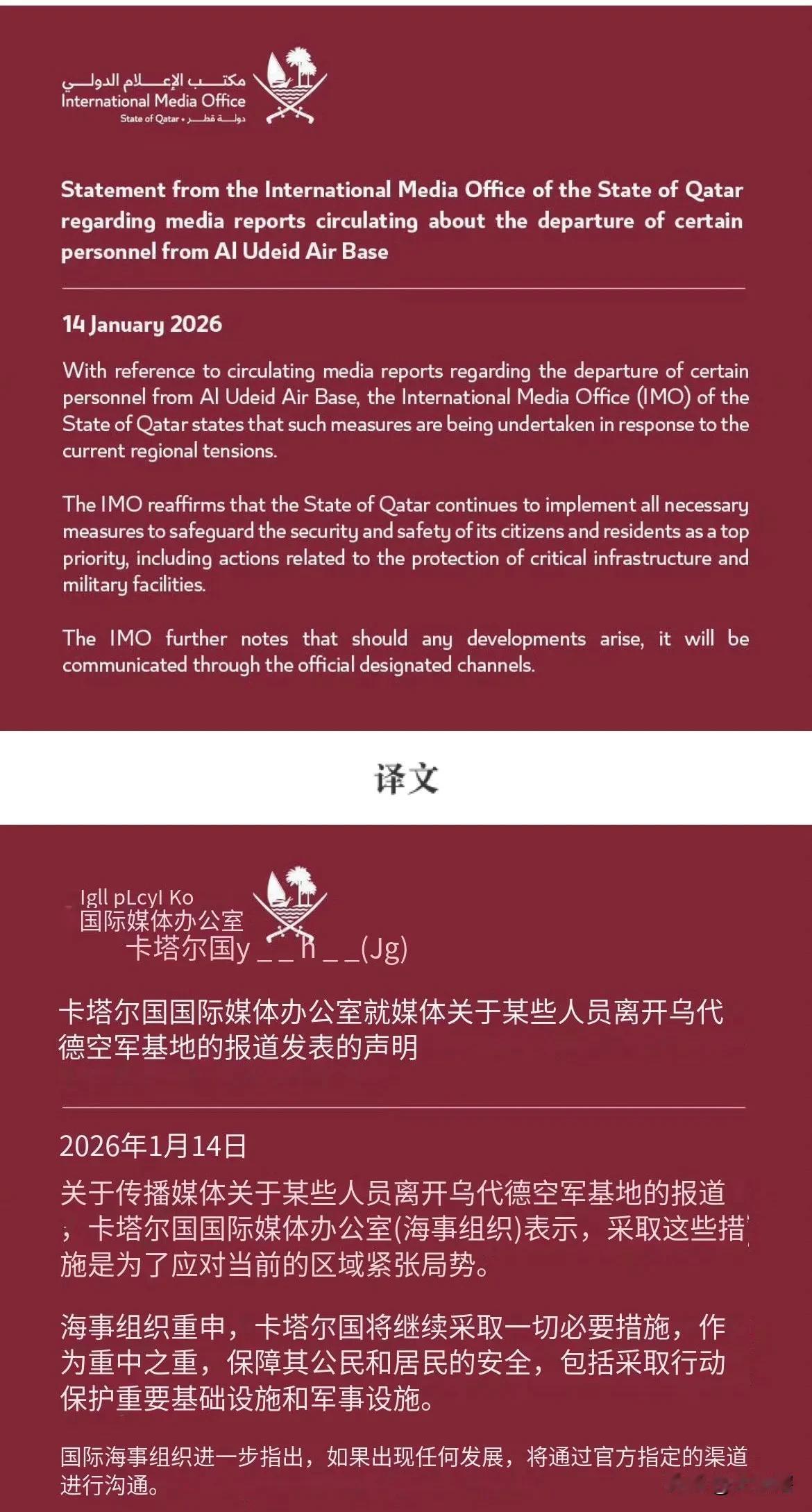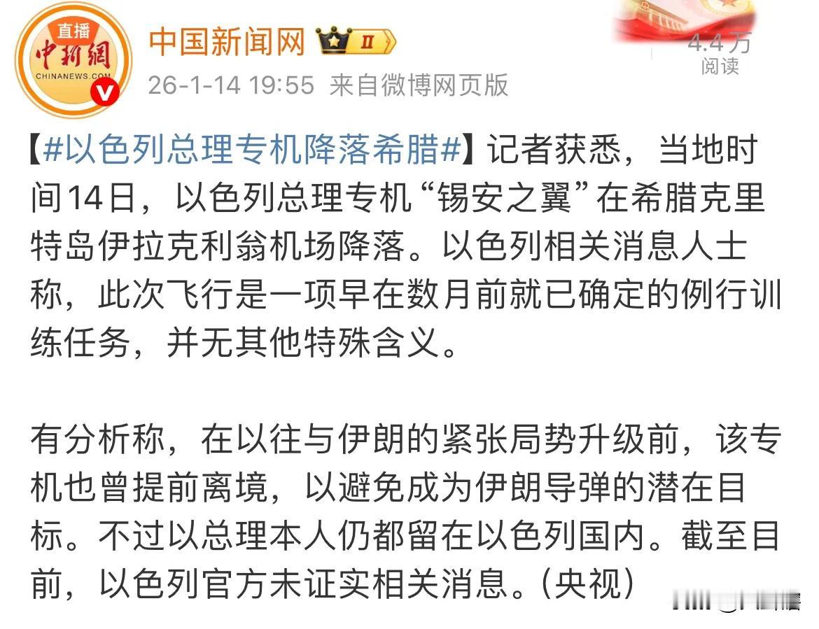 【局势升级,以色列总理专机疑似飞往希腊避险】 综合媒体消息,由于地区局势紧张,以色列总理专机降落希腊,疑似为了躲避来自伊朗的军事打击风险。 另据社媒消息,美军在卡塔尔的乌代德空军基地已经开始撤离人员。 种种迹象表明,美以针对伊朗的军事行动或以迫在眉睫。