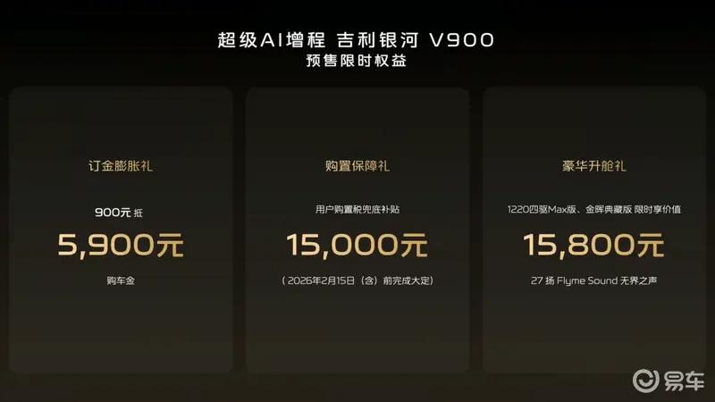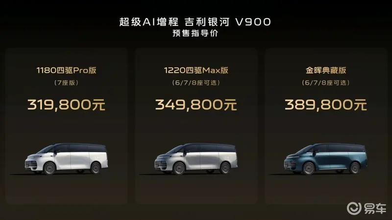 易车讯1月14日,吉利银河官方宣布吉利银河V900将于1月20日上市。银河V900于1月7日开启预售,预售价31.98-38.98万元。新车定位为大型MPV,车长超过5.3米,采用1.5T增程式动力。
