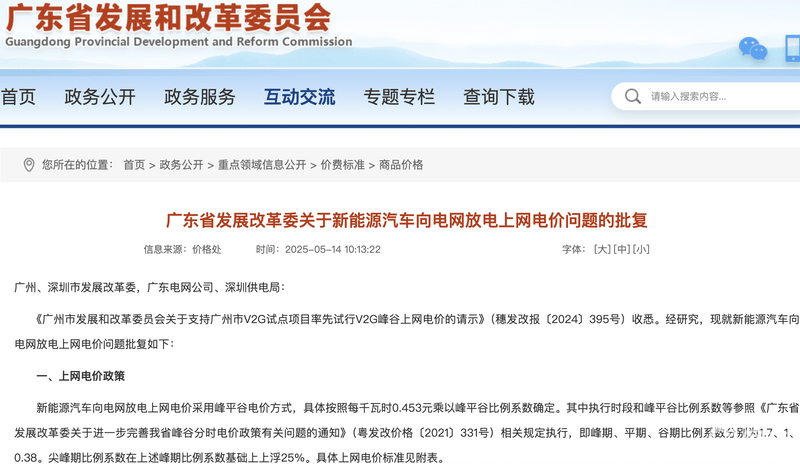 2025年,广东省发展改革委关于新能源汽车向电网放电上网电价问题的批复发布,明确“新能源汽车向电网放电上网电价采用峰平谷电价方式,具体按照每千瓦时0.453元乘以峰平谷比例系数确定”。针对其与传统分布式能源不同的上网结算方式,南方电网深圳供电局延伸建立V2G专门电价和结算模型,差异化设置分时计费公式,按照关键月份和其他月份高温天,对尖、峰、平、谷期电量精准计费,实现了新能源汽车作为分布式储能单元参与电网调节的价值量化。