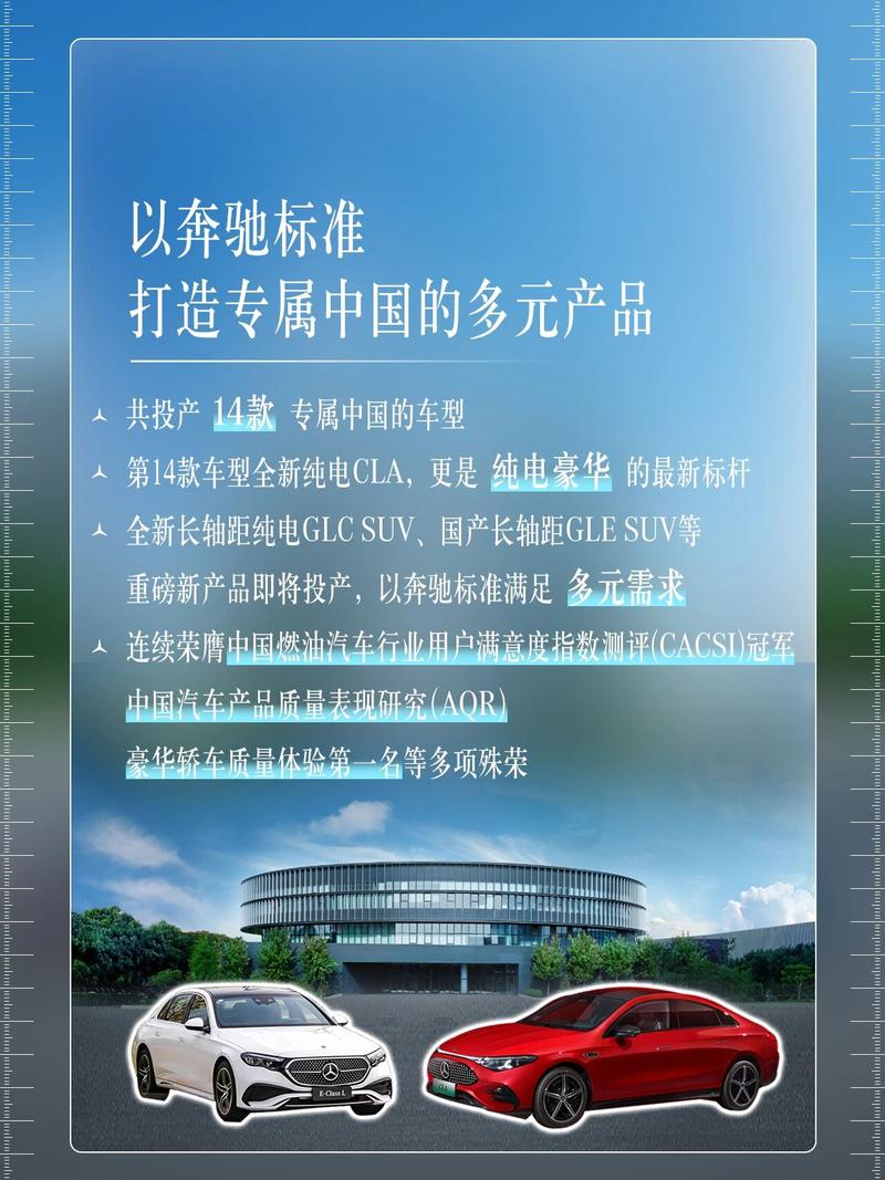 据介绍,北京奔驰是奔驰全球生产网络中规模最大、综合性最强、最先进的生产基地之一。工厂共投产14款专属中国的车型。全新梅赛德斯-奔驰长轴距纯电GLCSUV、梅赛德斯-奔驰国产长轴距GLESUV等新产品即将投产。
