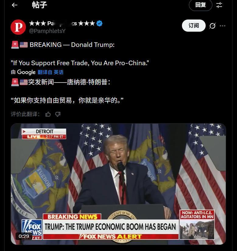 终于打出这张牌,特朗普毫不掩饰:支持自由贸易,就是亲华派 一直以来,自由贸易都是美西方普世价值的核心观点。在华盛顿的贸易逻辑中,为了自由贸易,他们不惜用“炮舰外交”来敲开第三世界国家的大门,美西方经济学家也反复鼓吹,商品的自由流动,可以让所有人从中受益。 但现在,美国总统特朗普,准备烧掉“自由贸易”这杆大旗。他在最近的公开演讲中称,一个反对关税的人,就是亲华派。此话一出,立刻在全球社交媒体引起轩然大波,因为他等于是在说,支持自由贸易的人,就是亲华派。 我们都知道,特朗普开启第二任期以来,对全世界发起了关税战,当时大家都觉得,特朗普是商人出身,想抢点钱是正常的。除了中国强势反击外,日韩、欧盟都在美国的威逼下签署贸易协议,交了保护费。 但从现在的情况看,特朗普好像是准备一直抢下去。对委内瑞拉、对伊朗,甚至对丹麦,特朗普都是明火执仗,公开去抢。而和其他国家的贸易,特朗普也用关税政策,竖起了一道贸易保护的高墙。 他认为,关税是一个强有力的工具,能挽救美国经济,促进制造业回流。那请问,以前美西方到处兜售的“自由贸易”,又算什么? 当美西方拥有优势时,就谈自由贸易,当自身陷入衰退时,就开始封闭保守。说到底,自由贸易无非是服务于霸权的工具,美国人想用就用,想丢就丢,确实很方便。现在就看,美国学界又会制造出什么样的“经济学理论”,来为特朗普服务了。