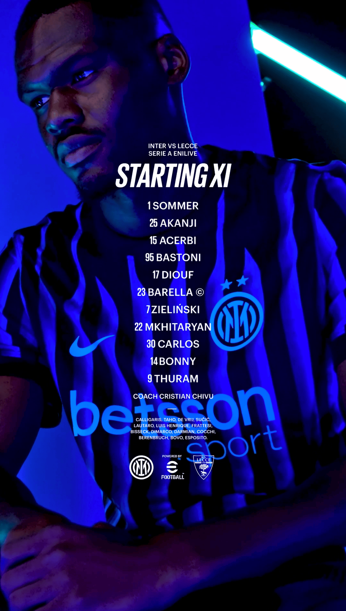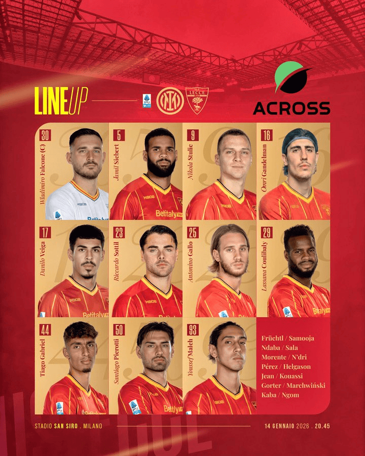 虎扑01月15日讯意甲第16轮,国际米兰主场迎战莱切的比赛即将开球,赛前,双方公布了本场比赛首发名单。
