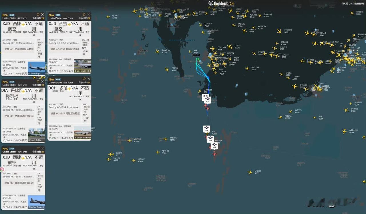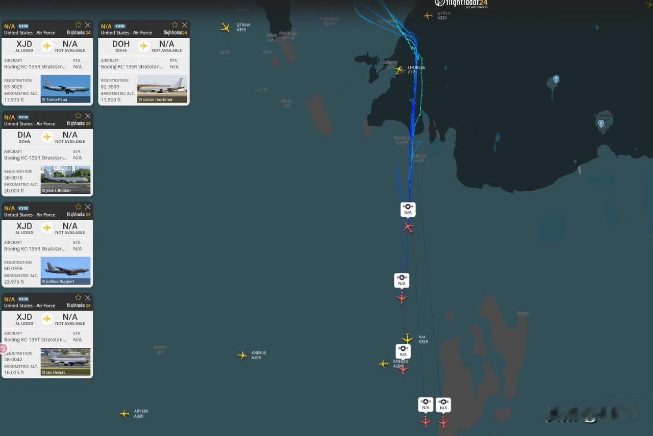 美国空军已开始从乌代德空军基地撤离军用飞机。现在,已有至少 5-6 架 KC-135R/T空中加油机陆续从卡塔尔的该基地起飞,向南飞行。与上次打击伊朗前的情况类似。数据来自 F24,现在,美军飞行正在实时进行。