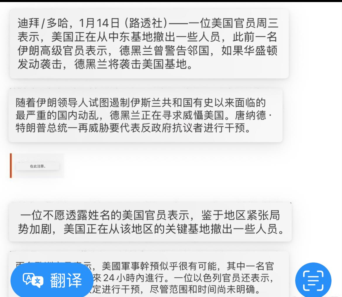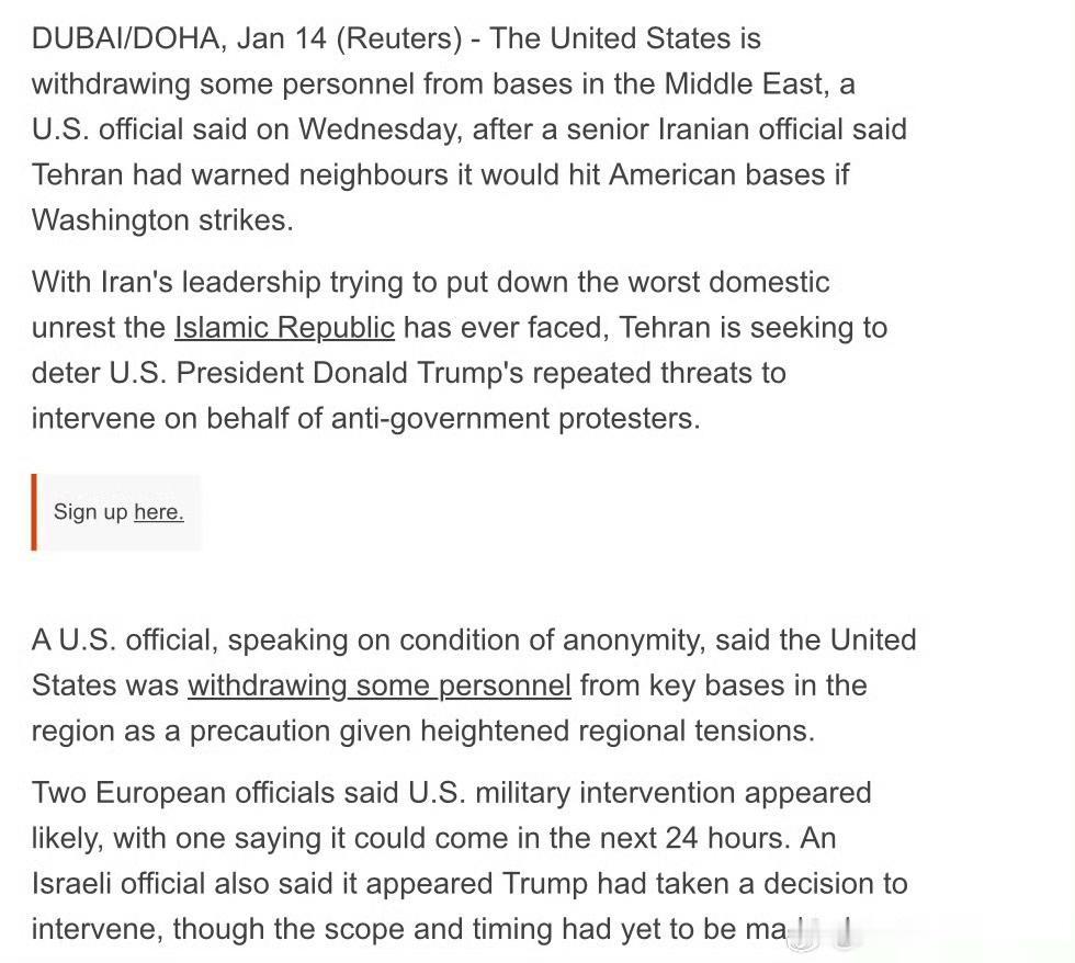 据路透社报道,欧洲官员认为美国极有可能在24小时内对伊朗实施军事干预。 据半岛新闻网报道,驻卡塔尔美军基地部分人员被要求在1月14日(周三)晚上之前离开位于卡塔尔的美国乌代德空军基地。 由此可见,这并非毫无根据的传言。当前,美军宣称正从乌代德空军基地撤离人员,英国也从卡塔尔空军基地撤出部分人员,美国国务院更是多次敦促公民离开伊朗。 特朗普多次召集战情室会议,商讨中东冲突事宜。尽管他对是否采取行动守口如瓶,但却不断对伊朗发出威胁。 地区紧张局势持续升级。中国驻卡塔尔使馆提醒在卡中国公民和中资企业密切关注有关新闻报道,加强安全防范。 可见,种种迹象表明,美以已经准备就绪!