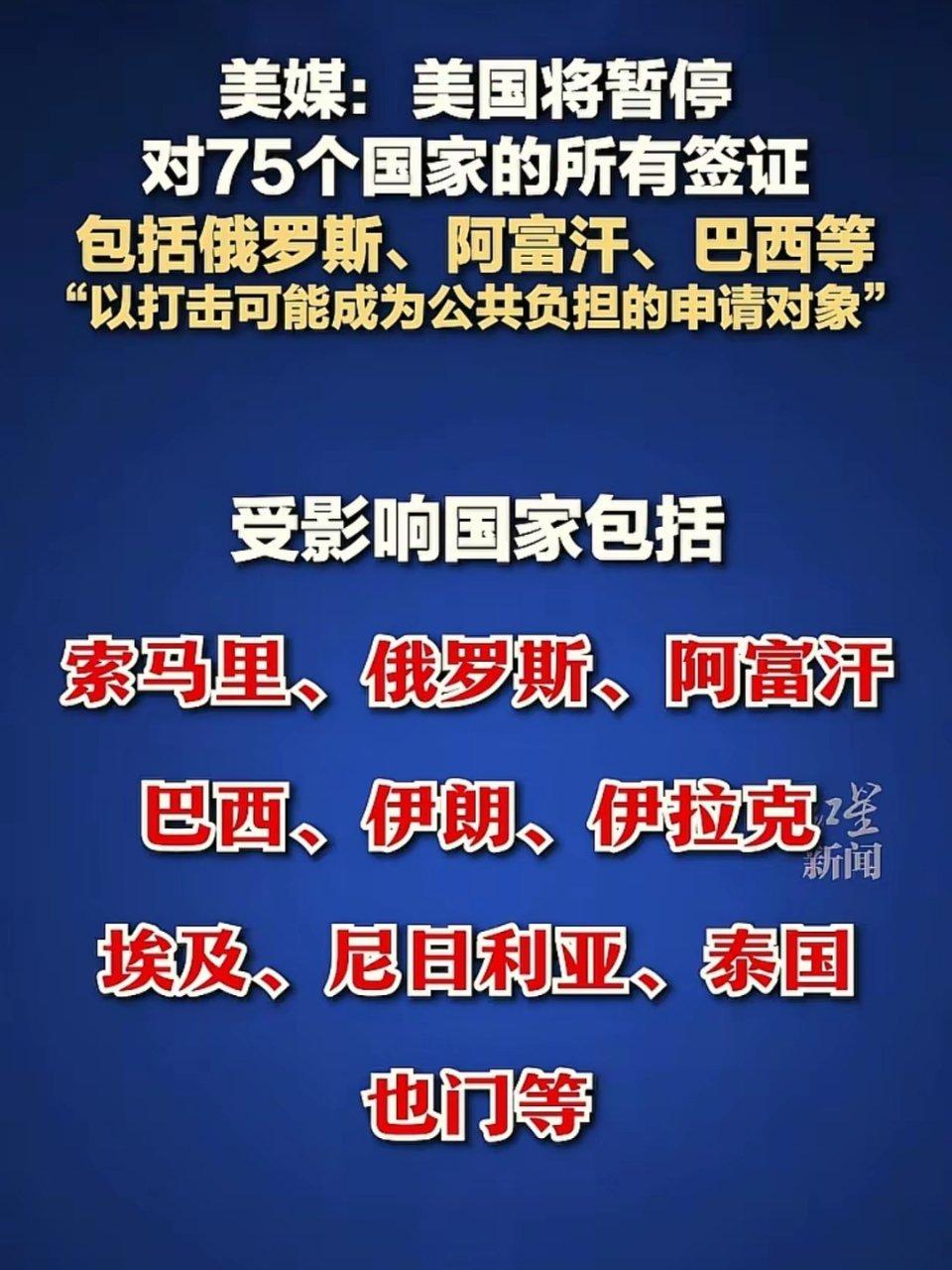 美国又在玩什么把戏——突然宣布暂停75国所有签证,简直想一出是一出,太不靠谱! 以“防公共负担”为由搞一刀切,1月21日起无限期执行,名单涵盖俄、巴、泰、埃等国,涉及20亿人。 此举不仅掐断全球人员流动,还冲击留学、旅游、侨汇产业链,更暴露其以签证为地缘博弈工具的私心。 估计因此美国本地的教育、旅游、跨境商务等相关行业,后续也会受到波及。真的是特离谱! 有网友吐槽:“粗略的数了一下,美加墨世界杯入围的球队有十几支队伍都没法拿签证了,分散在各个组。这是不打算办世界杯了么?还是这些球队只能在加墨踢了?” 对此,你想说点什么呢?