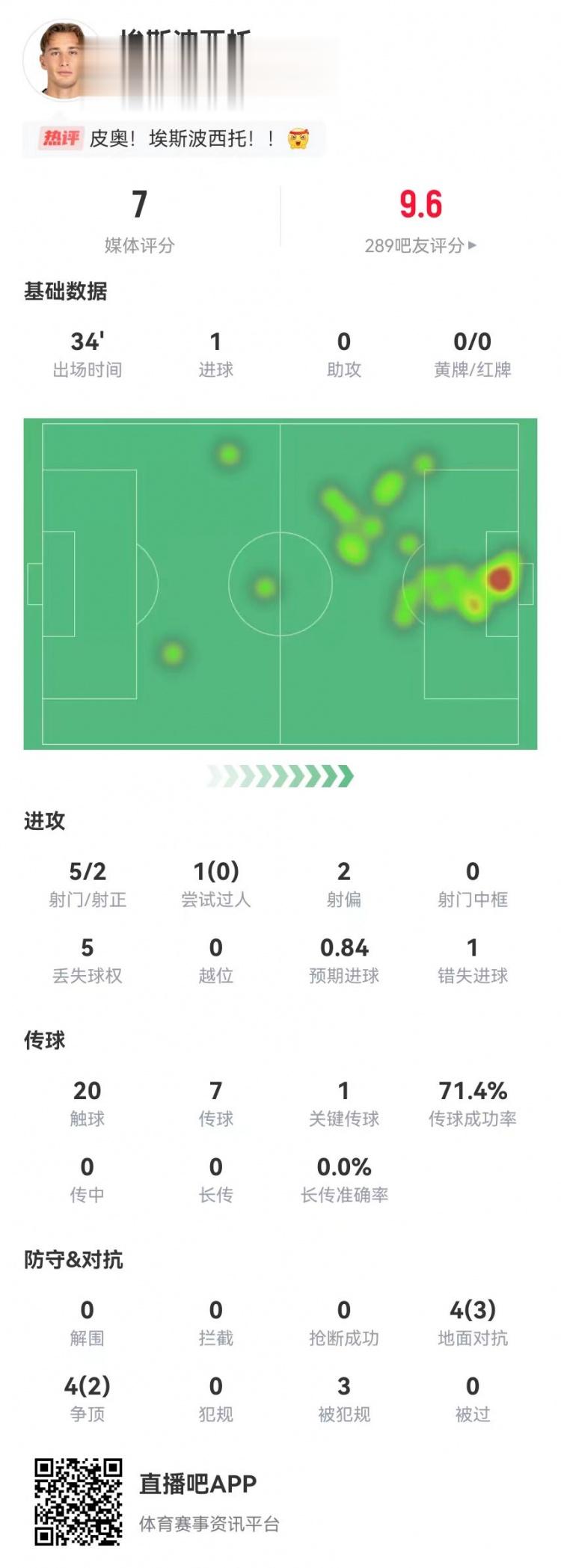 直播吧1月15日讯国米在本轮意甲1-0小胜莱切,埃斯波西托本场数据如下:
