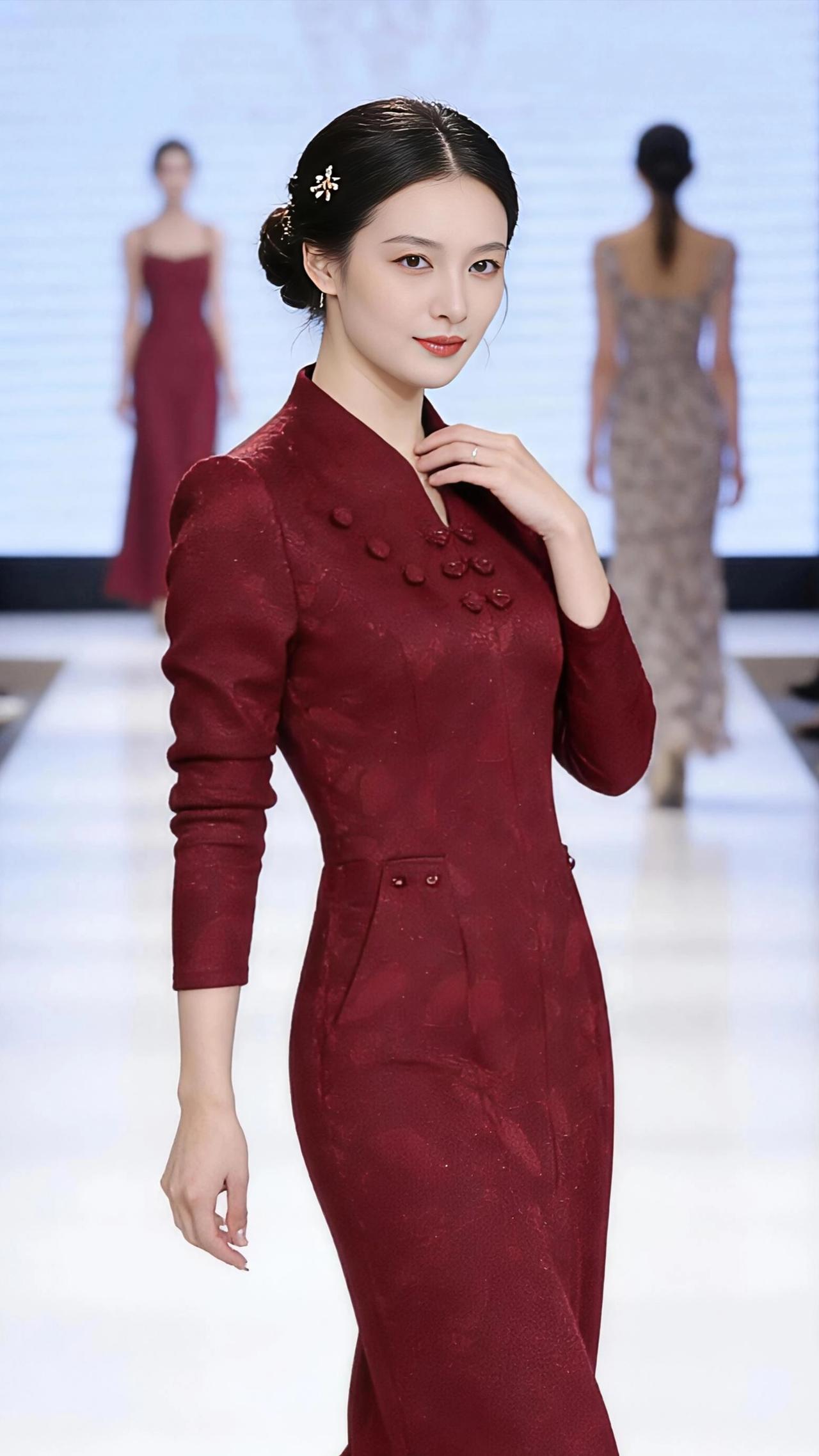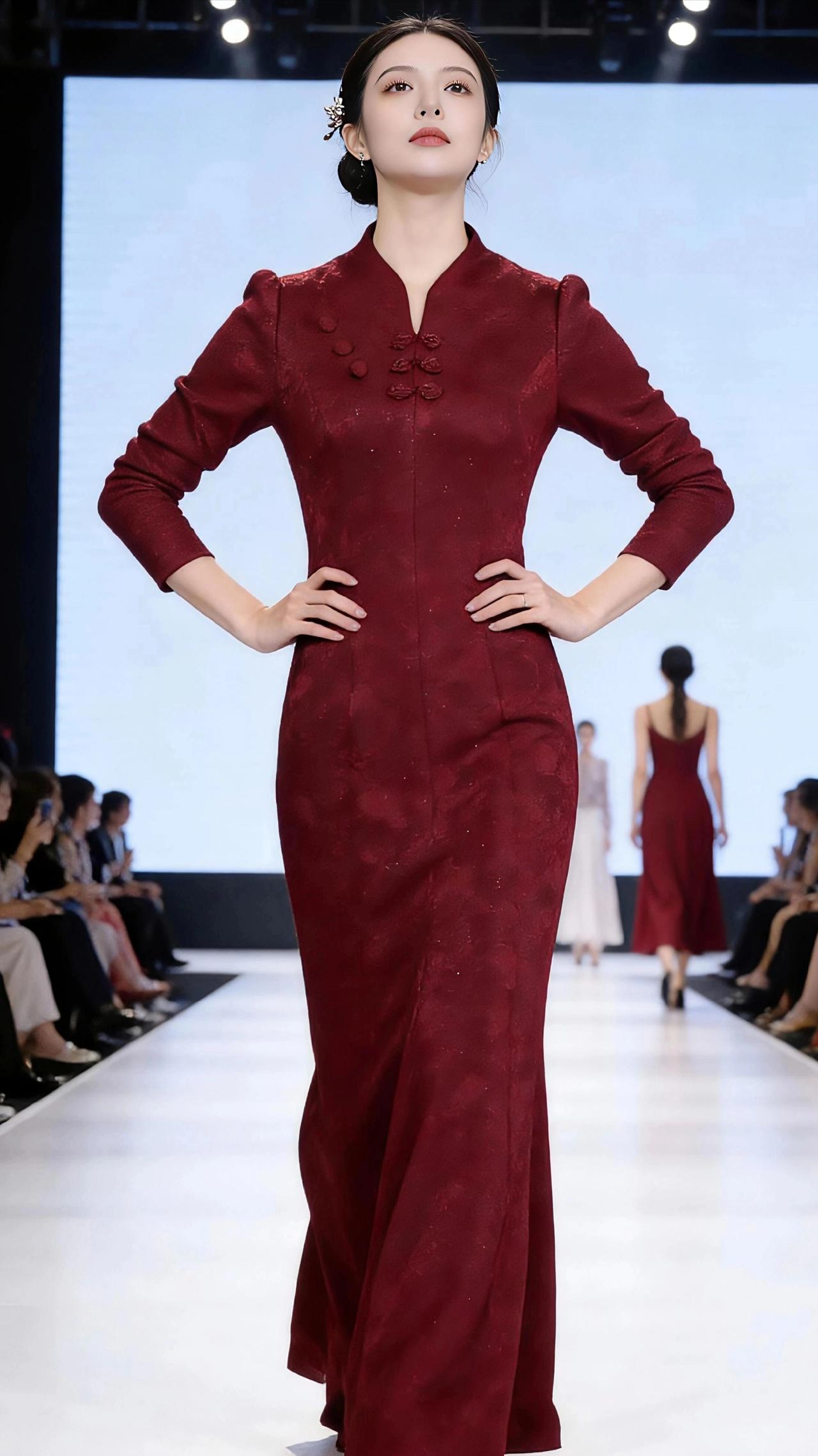 红绸步香阶 酒红的裙裾如凝结的赤霞,在T台的白光里漾开柔缓的弧。模特踩着细跟鞋,步点轻叩如落梅,那身立领旗袍似裁了江南的秋霞,盘扣如朱梅缀在襟前,暗纹在灯光里浮着细碎的光,像揉进了一捧星子。 低盘的发鬓簪着银质小花,碎发绕着鬓角蜷成柔波,转身时脊背的线条如青瓷瓶肩的弧度,手轻提裙边的刹那,酒红面料垂落的褶皱,竟像流水漫过红砂石的纹路。她回眸时,眼波里盛着T台顶的光,台下的影影绰绰成了模糊的背景,唯有那抹酒红,是舞台中央烧得最烈的焰。 后方的模特踩着同款红裙的影,大屏幕映着旗袍的纹,观众的目光织成柔网,却网不住这抹红的翩跹。她叉腰而立时,肩线挺得如松,垂手前行时,指尖又柔得似柳,一刚一柔间,把东方的韵致揉进了每一步走秀里。这红裙裹着的,是岁月沉淀的温婉,也是舞台赋予的锋芒,在T台的方寸间,走出了一场独属于东方的浪漫。 高级感穿搭 时尚穿搭 新年穿搭 冬季穿搭