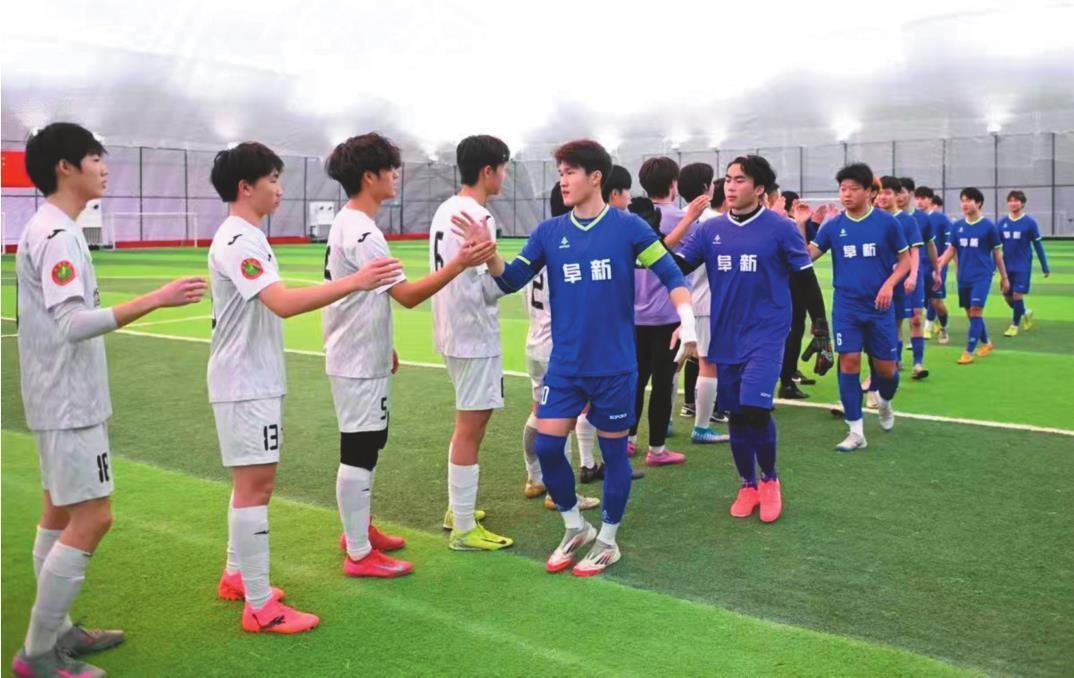 第一届“东北超”沈阳都市圈选拔赛沈阳队与阜新队比赛前,两队球员握手致意。本报记者孙海涛摄