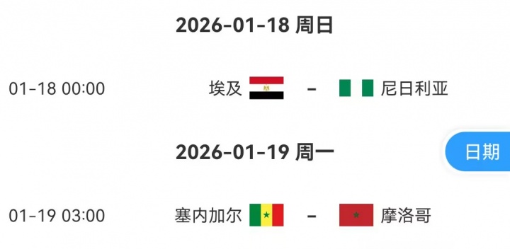 三四名决赛将于北京时间1月18日0:00进行,由埃及对阵尼日利亚。