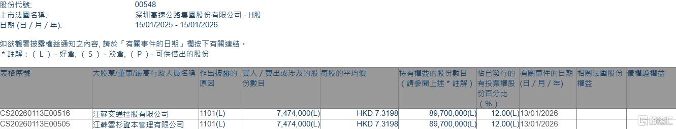 格隆汇1月15日丨根据联交所最新权益披露资料显示,2026年1月13日,深圳高速公路股份(00548.HK)获江苏云杉资本管理有限公司在场内以每股均价7.3198港元增持747.4万股,涉资约5470.82万港元。