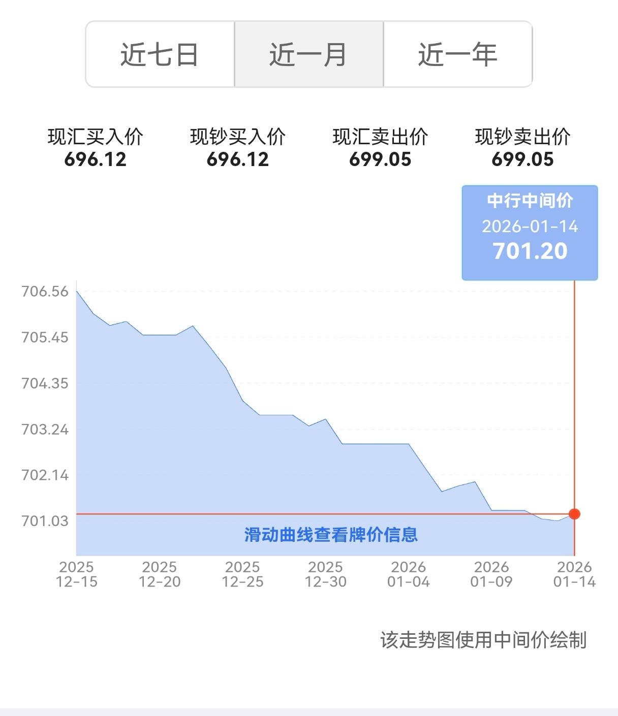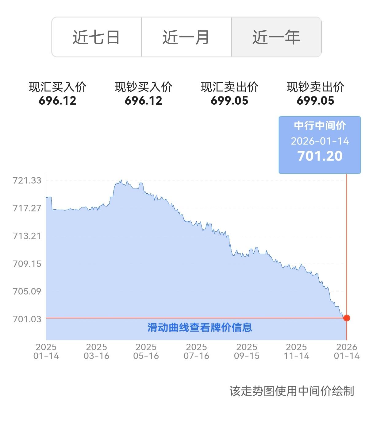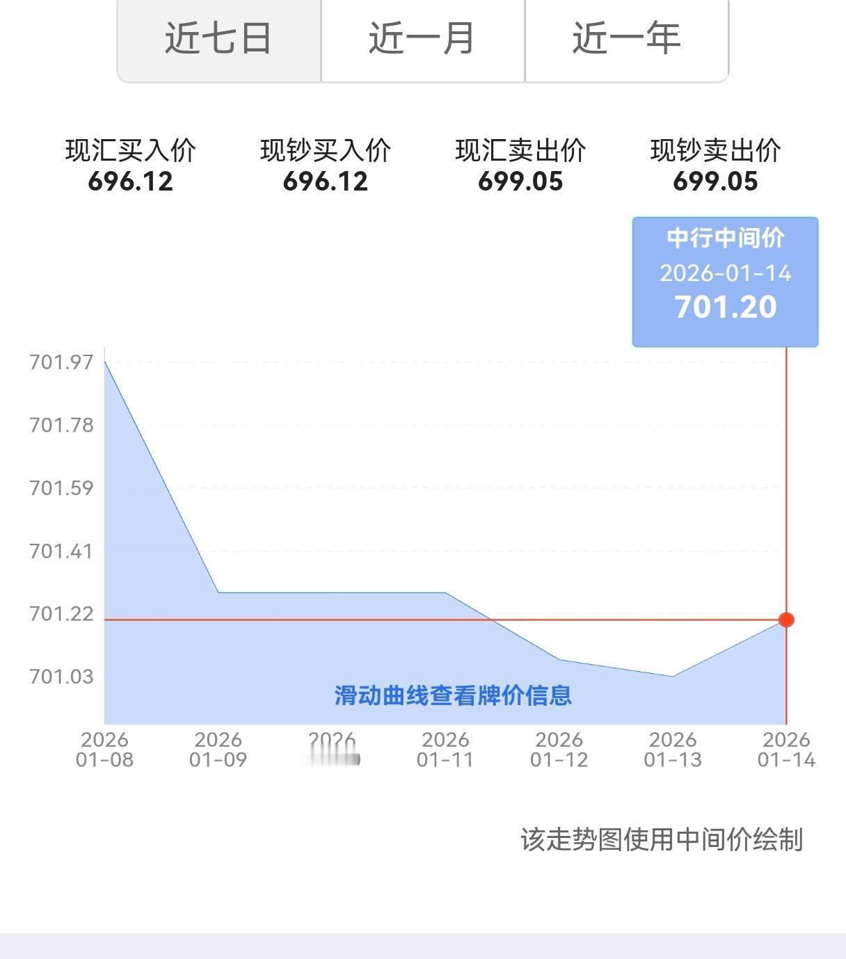 这几天主要去关注委内瑞拉、伊朗和格陵兰岛,忘了关心自家的事情。一早起来,想看看近期的汇率,不看不知道,一看吓一跳,人民币真的破7了。无论是周曲线、月曲线还是年曲线,都在波底。现汇银行卖出价699.28,现钞银行买入价696.35。图来自中国银行。