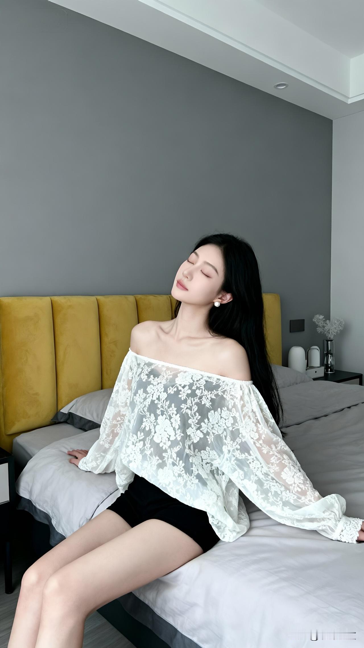 白蕾丝衫配黑短裤,这组穿搭把纯欲风玩明白了! 谁能拒绝纯欲风天花板的魅力?室内卧室场景里,女神一袭白色蕾丝露肩衫搭配黑色高腰短裤,冷白皮在蕾丝的映衬下更显通透,露肩设计勾勒出精致的锁骨与肩颈线条,宽松的蕾丝袖又添了几分慵懒的仙气。 高腰黑短裤收紧腰线,将优越的身材比例展现得淋漓尽致,她或坐于床沿或倚靠床头,闭眼享受的姿态慵懒又撩人,乌黑长卷发垂落肩头,珍珠耳饰的小点缀让整体造型更显精致。这样的纯欲穿搭是不是瞬间戳中你的审美?你觉得这组造型的纯欲感能打多少分? 纯欲风穿搭 白蕾丝衫 黑白配穿搭 冷白皮女神