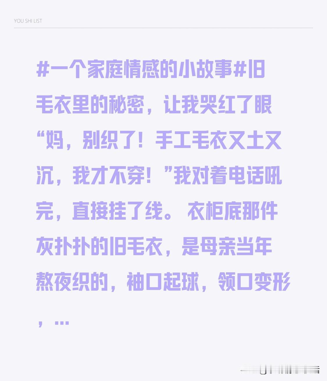 旧毛衣里的秘密,让我哭红了眼 “妈,别织了!手工毛衣又土又沉,我才不穿!”我对着电话吼完,直接挂了线。 衣柜底那件灰扑扑的旧毛衣,是母亲当年熬夜织的,袖口起球,领口变形,我嫌丑,压了十年箱底。 直到今天整理衣柜,毛衣里掉出张泛黄纸条:“晚晚,你爸催我织快点,怕你在城里冻着,线是最好的羊毛,软和不扎人。” 瞬间泪崩。想起母亲灯下织衣的身影,想起我每次嫌弃时她的失落,想起她退掉毛线时小心翼翼的转账语音。 我拨通电话哽咽:“妈,我要雾霾蓝麻花针,你织的最暖。”电话那头,母亲笑出了哭腔。 那件藏着父母牵挂的旧毛衣,我终于懂了它的珍贵。可母亲织新毛衣时,又悄悄加了什么暖心小心思?点赞关注,下期看我拆穿母亲的“温柔诡计”!温柔毛衣 毛衣 旧时的毛衣