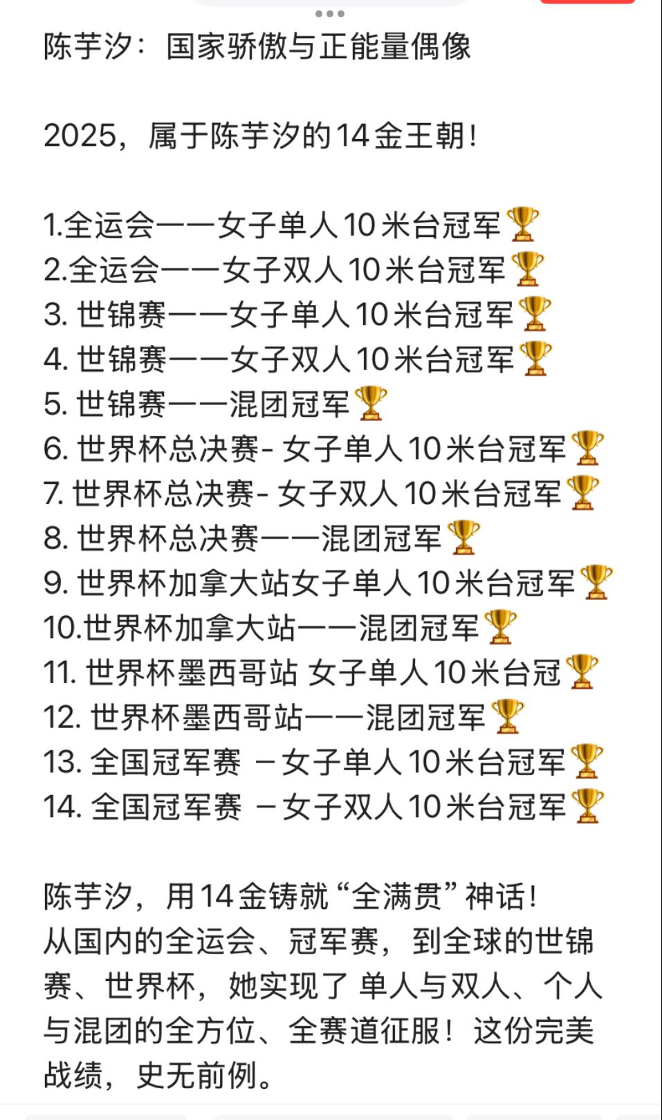 2025年陈芋汐14枚金牌的分量, 远超她那两枚错失的奥运金牌。 奥运金牌,诚然是运动员梦想的圣殿, 然而,它的评判也交织着临场瞬息、 对手状态,乃至无可预测的命运偶然。 而陈芋汐在2025达成的全年"全满贯"一一从国内赛场到世锦赛之巅, 从单人项目到团体荣耀一一 是一场贯穿三百六十五天、 覆盖所有赛道的系统性征服。 这十四枚金牌, 每一枚都代表着她在一个确定的时间、 确定的地点, 以无可争议的统治力赢下的战斗。 它们不是一次灵感的进发, 而是一种状态的绝对维系; 不是命运的垂青,而是实力的绝对兑现。这意味着,在过去一年里, 她是这个项目上不可撼动的唯一法则。 她击败的不仅是同台的对手,更是时间、压力、伤病和所有可能的变数。 而最核心的超越在于: 奥运金牌回答的 是"谁是那一天的巅峰", 而全年全满贯全满贯回答的 是"谁是这个时代的统治者"。 前者是瞬间的、带有故事性的勋章, 后者是持久的、 需要钢铁意志铸就的王座。 陈芋汐用她的十四金证明, 她已从"争夺者"蜕变为"定义者" 一一她重新定义了“胜利”的形态, 从追求一个至高的点, 到将整个赛季的平面都变成自己的领地。 因此,当人们谈论 那两枚奥运金牌的“缺失”时, 陈芋汐用一整个王朝的版图作出了回应。这回应无声却震耳欲聋: 伟大无需被单一的标准束缚, 真正的王者, 可以创造属于自己的标准。
