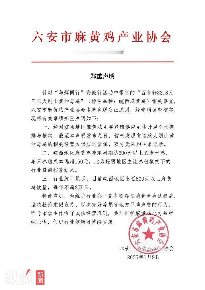 这则《声明》称,针对“与辉同行”安徽行活动中带货的“百食轩83.8元三只大别山黄油母鸡”(标注品种:皖西麻黄鸡)相关事宜,六安市麻黄鸡产业协会进行了调查核实:皖西地区麻黄鸡主要养殖供应主体并未向“大别山黄油老母鸡”的经营方供应过皖西麻黄鸡,养殖周期达500天以上的皖西麻黄鸡单只成本在150元以上,皖西地区出栏的500天以上的麻黄鸡,每年数量不足两万只。该协会在《声明》中表示,坚决杜绝虚假宣传、以次充好等损害地方品牌声誉的行为。