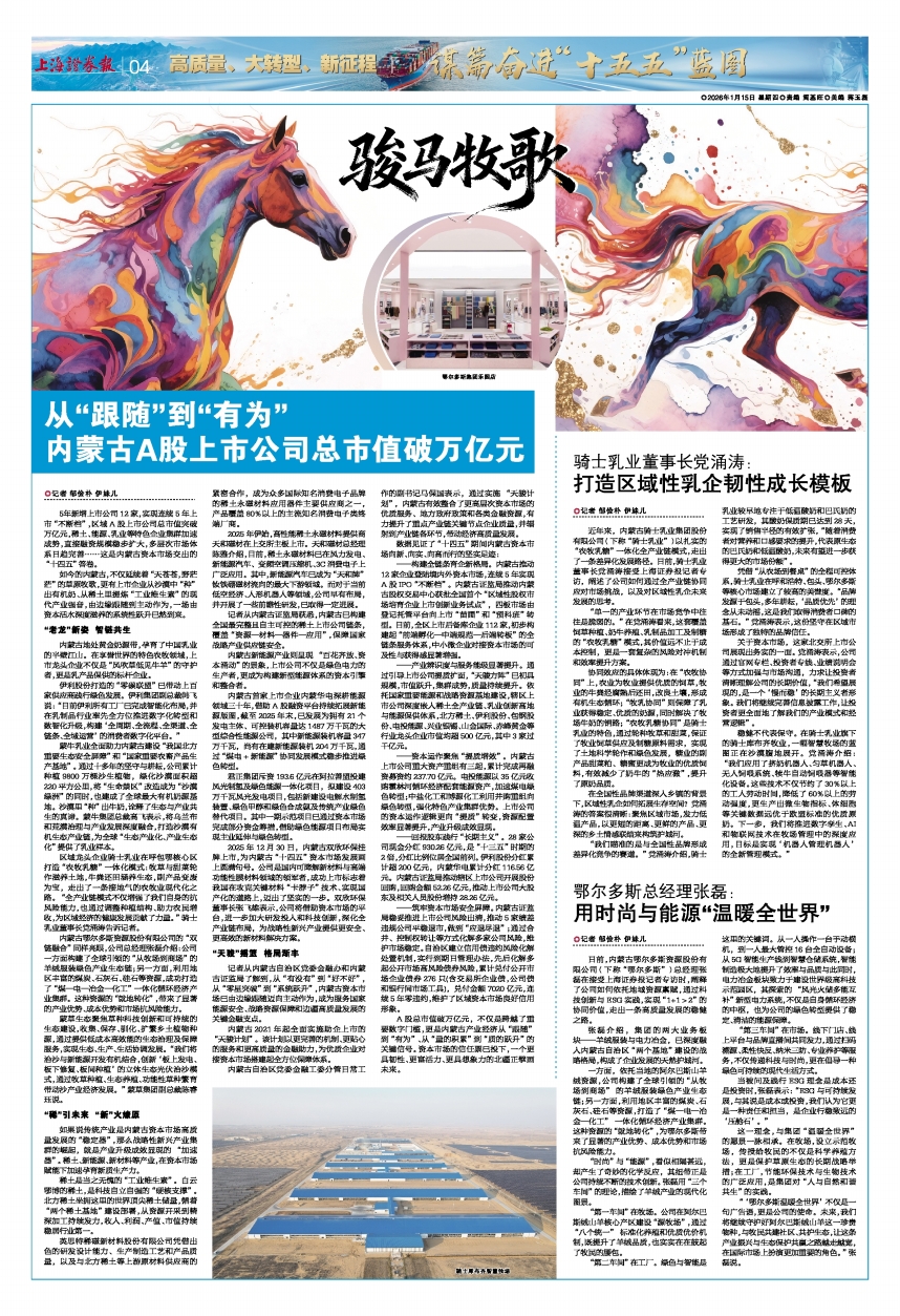 日前,内蒙古鄂尔多斯资源股份有限公司(下称“鄂尔多斯”)总经理张磊在接受上海证券报记者专访时,阐释了公司如何依托地域资源禀赋,通过科技创新与ESG实践,实现“1+1>2”的协同价值,走出一条高质量发展的稳健之路。