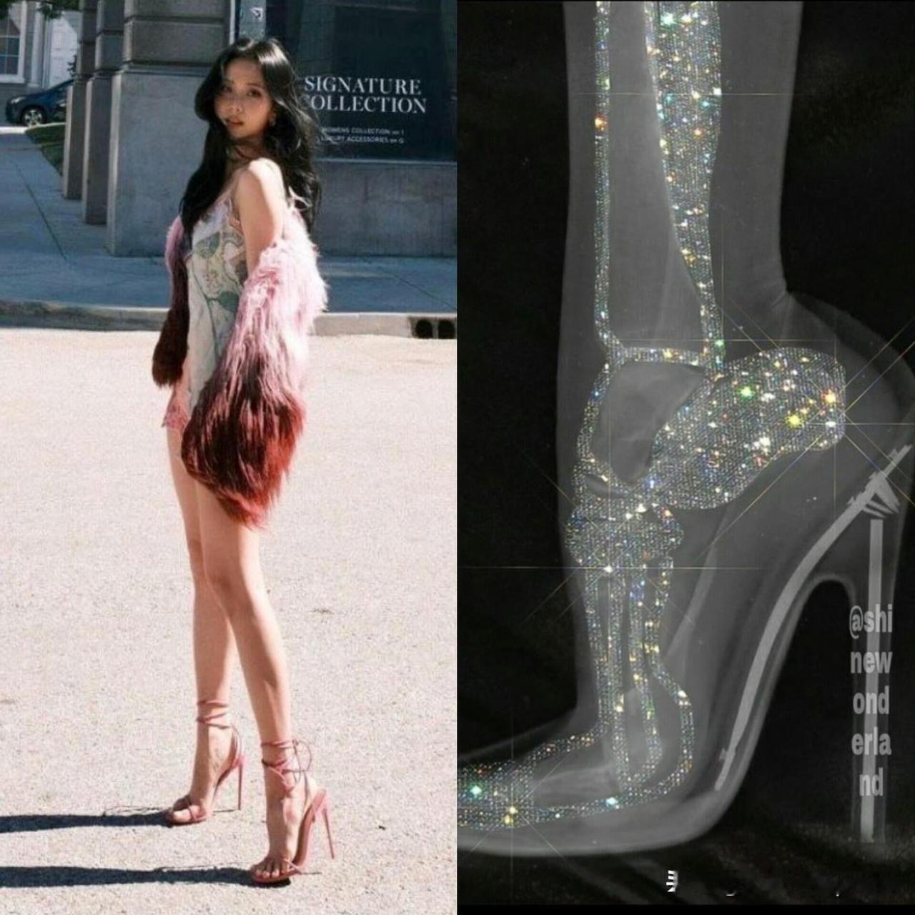 金智秀这鞋跟也太高了! 脚背简直崩成直角尺🤯 不愧是红毯“美丽刑具”,看着腿