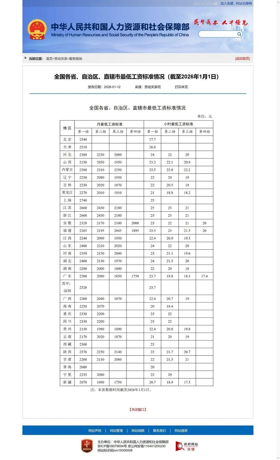 退休工资涨不涨还不知道,但是最低工资已经率先上涨了 人社部官网最近更新了截止2026年1月1日的最低工资标准,这是最新的标准一览表了。 可以看到,随着江苏和浙江从元旦起上调最低工资标准,最低工资标准的格局已经发生了大变化。 第一名还是没变,依然是大上海,2740元,而且这还不包括个人应该缴纳的五险一金部分,含金量十足的。 但是第二名发生了变化,浙江和江苏以2660元超越了北京的2540元,并列第二名了。北京丢掉了第二的位置。 不过需要说明的是,北京的最低工资标准含金量更高,因为也是不包含个人应该缴纳的五险一金的。这一点是需要说清楚的。 思之想之发现,就看第一档最低工资标准的话,全国没有一个地区低于2000元了,都在2000元以上了。 国家也说了,今年会制定实施城乡居民增收计划,这会让更多人钱袋子鼓起来的,因为最低工资标准上调是一个重要的手段。 至于退休人员关心的退休工资涨不涨,退休人员养老金涨不涨,要等到3月份才知道答案了。 关注思之想之,及时了解2026年养老金调整最新消息。