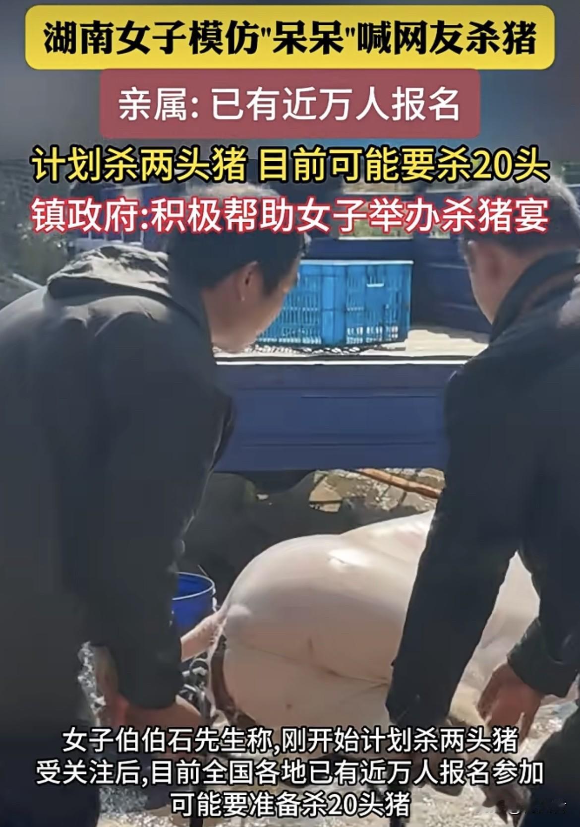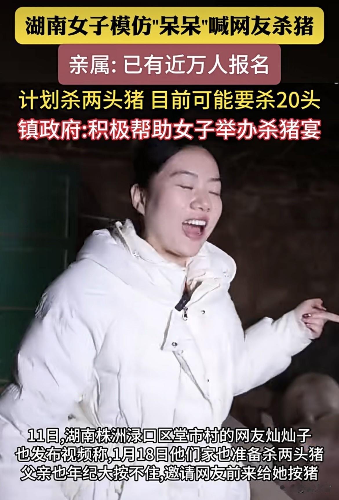 惊动万人!湖南女子“复刻”网红杀猪宴,两头变二十头,全村沸腾! 还记得那个喊网友帮忙杀猪、结果涌来数千人的重庆女孩“呆呆”吗?这股互联网的“热浪”瞬间席卷到了湖南!一位湖南妹子果断模仿,本想只是解决家里杀猪人手不足的小问题,结果一嗓子喊出去,直接引爆了全网的热情! 原本家里盘算得好好的,两头肥猪,自家亲戚朋友加上帮忙的,足够吃了。谁能想到,这波网络传播的威力简直堪比“核爆”!报名的人数像坐火箭一样飙升,据说规模直逼,上万人!这阵仗,别说杀猪了,感觉都要赶上一场盛大的音乐节了! 这下可真是“幸福的烦恼”了。为了招待好这四面八方、千里迢迢赶来捧场的“干兄弟、干姐妹”们,原本计划的两头猪,眼瞅着得翻着跟头往上涨,估计要杀上二十头大肥猪才能勉强应付这人山人海的壮观场面! 这哪是杀猪啊,这分明是一场跨越山海的万人美食狂欢派对! 好在,当地政府和镇里也是相当给力,没有袖手旁观,而是火速介入,积极协助举办这场“盛大的团年饭”。这不仅仅是吃顿饭,更是一次绝佳的机会!如果这事儿办成了,那场面,光是想象一下万人空巷、炊烟袅袅、肉香四溢的景象,就让人热血沸腾!