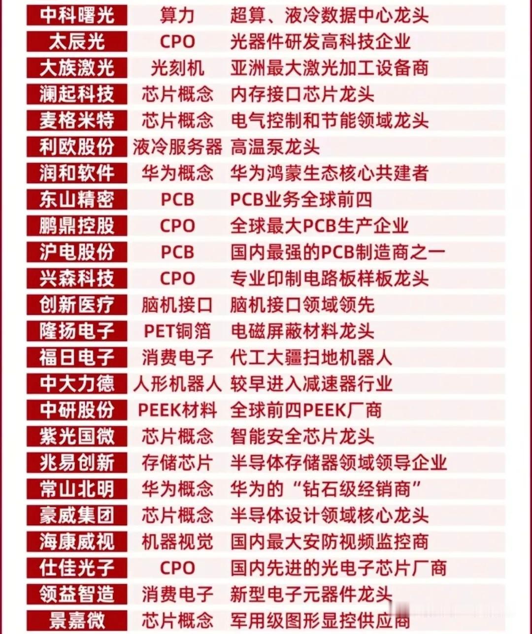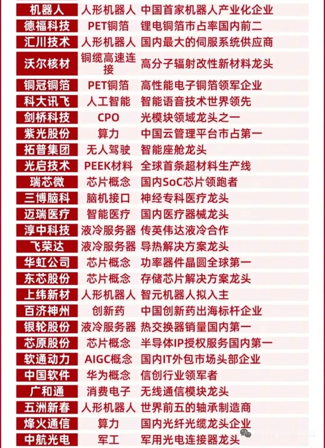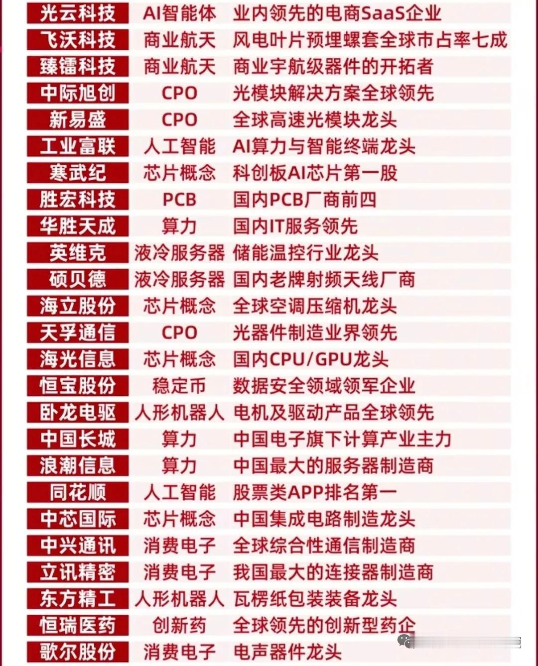 A股核心资产人气龙头全梳理!从商业航天、AI算力到芯片、人形机器人,覆盖光伏、军工、创新药等热门赛道,各细分领域的龙头标的一目了然,这份强辨识度名单,收藏起来,把握市场主线方向! 中科曙光:算力赛道龙头,在超算、液冷数据中心领域占据领先地位。 科大讯飞:人工智能赛道代表,智能语音技术处于世界领先水平。 紫光股份:算力赛道龙头,中国云管理平台市占率第一。 剑桥科技:CPO赛道龙头,在光模块领域处于领先地位。 中兴通讯:消费电子龙头,为全球综合性通信制造商。 科技龙头虽具人气,但股市有风险,投资决策需建立在自身研究与风险承受能力之上,切勿盲目跟风。科技龙头≠稳赚不赔,投资有风险,入市需谨慎。AI算力板块 股票排行 科技龙头概念股 深入科技股分析 个股人气排名